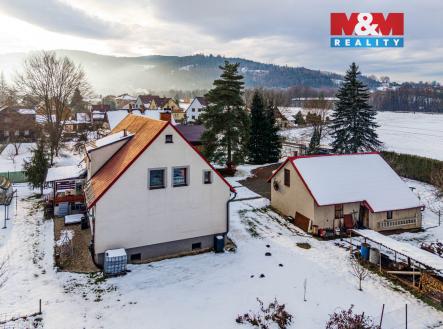Nabízíme k prodeji výjimečný rodinný dům v malebné obci Pražmo, se zastavěnou plochou 140 m2 a užitnou plochou více než 180 m². K domu náleží rozlehlý pozemek o výměře 6.250 m². Perfektní místo pro rodinné bydlení či rekreační využití. Dispozice - v přízemí 4+1 a v 1. NP 2+1 prostorných místností. V každém patře se nachází koupelna i toaleta. Tento samostatně stojící zděný dům je po rozsáhlé rekonstrukci a ve velmi dobrém stavu: zateplení, dřevěná euro okna, rozvody elektřiny a vody apod. Dům je celý podsklepený, s kotelnou a garáží. K domu dále náleží dvě samostatné garáže a okrasná oplocená zahrada s nádvořím o ploše 1.694 m2. Nechybí zastřešená terasa, balkon, studna, skleník, el. brána a dostatek parkování. K nemovitosti náleží i pozemek s trvalým travnatým porostem a potokem s plochou 4.694 m2, ideální jako pastvina. Skvělá celoroční dostupnost. V obci veškerá občanská vybavenost (škola, školka, obchody, pošta, zastávka autobusu 750 m). Nechejte se okouzlit touto příležitostí.