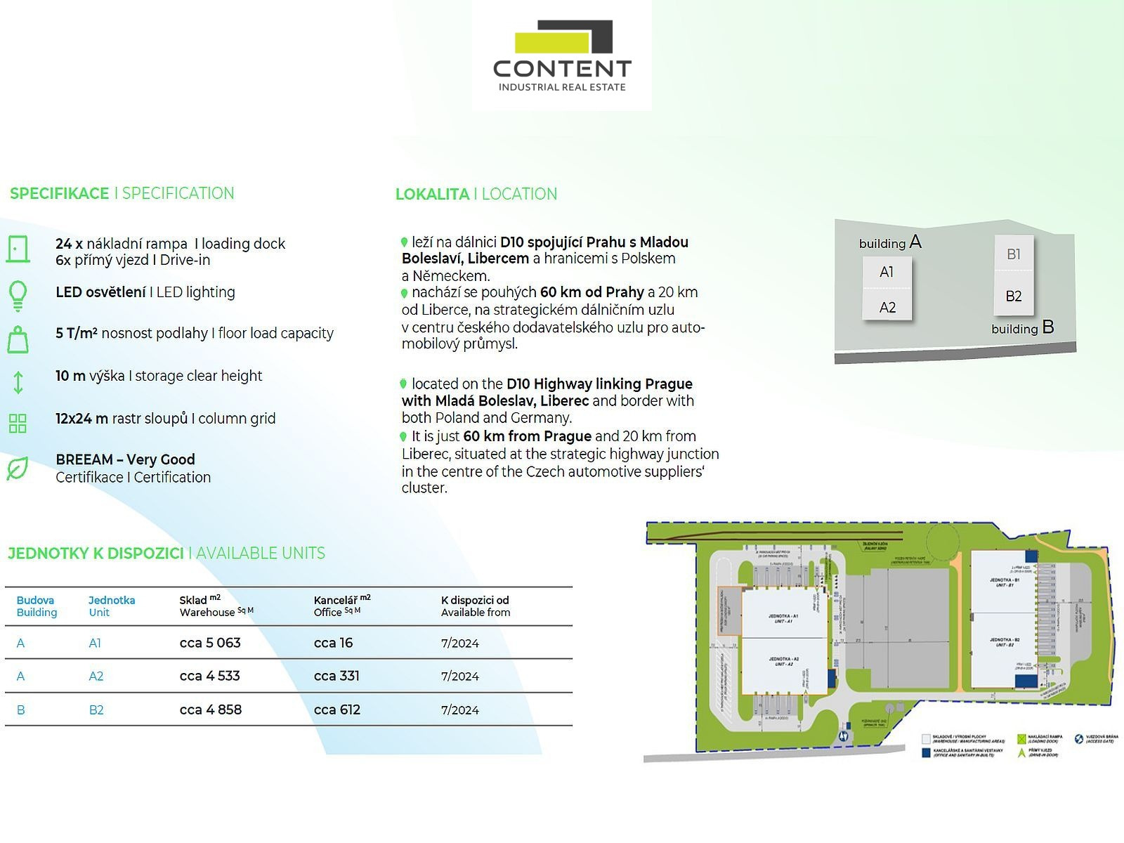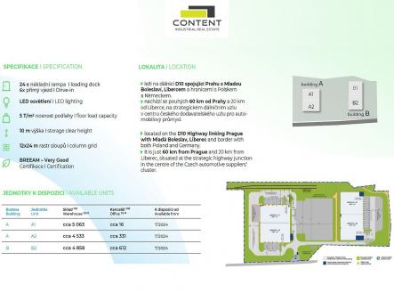 Pronájem industriálních prostor 2000 m² Příšovice. V zastoupení majitele a bez provize nabízíme novostavbu výrobních nebo skladových prostor o velikosti 5079 m², umístěných v rámci průmyslového areálu s ostrahou, u exitu E67 z dálnice D10. Areál se nachází 25 km od hlavního výrobního závodu Škoda Auto Mladá Boleslav. - k dispozici ihned (jednotka B2) - skladová/výrobní plocha 2000 - 5079 m² - nové bezprašné podlahy s minimální nosností 5 t/m², - moderní, úsporná budova s certifikátem udržitelnosti BREEAM - "very good", - 5x hydraulická rampa - 1x drive-in (přímý vjezd) - světlá výška 10,5 m, - sociální a kancelářské zázemí na míru, - úsporné LED osvětlení, sprinklery, - příjezd a parkování TIR bezproblémové, - oplocený areál s ostrahou, EZS, EPS - vzdálenost 1,9 km od exitu E67 z dálnice D10, - možnost budoucí expanze v rámci areálu, - možnost napojení na železniční vlečku, Cena bude stanovena individuálně dle konkrétních podmínek smlouvy. Pro více informací nás kontaktujte. Doporučujeme prohlídku nemovitosti.