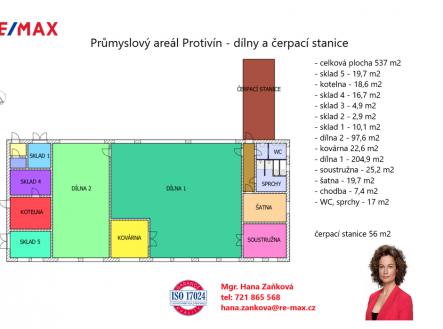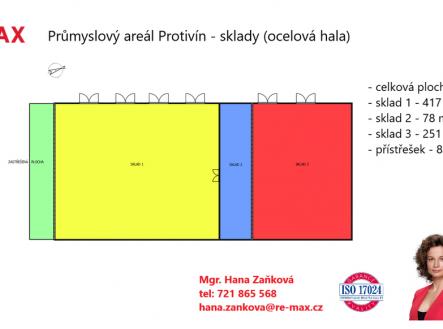 Nabízím k pronájmu průmyslový areál v Protivíně o celkové ploše 14.689 m2 s vynikající dopravní dostupností a dvěma vjezdy. Areál lze využít pro zázemí firem, sklady, servisy strojů a vozů, služby, kanceláře či ubytování. Průmyslový areál se skládá z : A. - dvoupodlažní budovy (užitná plocha 503 m2) se zázemím pro administrativu včetně stravovací, ubytovací a skladovací kapacity. V prvním podlaží se nachází 3 kanceláře, 2 sklady, jídelna/jednací místnost, 2 kuchyně, převlékárna, toalety pánské/dámské, koupelna. V druhém podlaží je 9 místností, které lze využít jako kanceláře či ubytování, dále se zde nachází koupelny a sociální zařízení, technická místnost, kuchyně. Dříve 2NP sloužilo jako ubytovna zaměstnanců a byt správce areálu. Budova je zděná, plastová okna, vytápěna plynem, napojena na elektřinu, kanalizaci a vodu, přípojka telefonu- Cetin, internet. B. - dílen (zastavěná plocha 537 m2) a čerpací stanice na naftu (56 m2) pro zemědělské stroje či nákladní vozidla. Výška stropu dílen 6 m, 3 vjezdy do dvou dílen jsou zajištěny sekčními vraty (výška 5 m, šířka 5 m), portálový jeřáb, 360 V. Dále se zde nachází sprchy, toalety, umývárna, kovárna (lze použít jako kancelář), sklady a šatna. Dílny jsou zděné, napojeny na vodu, elektřinu a kanalizaci, vytápěny plynem. C- skladů (zastavěná plocha 754 m2) s výškou stropu 8,3 m, šesti vjezdy ocelovými vraty (výška 3,3 m, šířka 3 m) a zastřešenou plochou 89 m2. Jedná se o budovu tvořenou ocelovou konstrukcí napojenou na elektřinu, 360 V. D- zpevněné plochy a travní porost o ploše 10.649 m2 E- zeleň se stromy a keři o ploše 1.521 m2. Areál je monitorován kamerovým systémem se záznamem, je střežen soukromou firmou. Průmyslový areál je oplocený, vjezd k areálu je zajištěn po celoročně udržované komunikaci. Areál se nachází u hlavního tahu silnice E49 (směr České Budějovice/Linz - Praha), v dojezdové vzdálenosti cca 20 km od dálnice, 15 km od Písku, 38 km od Českých Budějovic, 1,3 km od centra města Protivín. V sousedním areálu Wotan Forest je přivedena železniční vlečková kolej s platnými revizemi, smlouvou o styku drah a smlouvou o provozování drážní dopravy se čtyřmi různými dopravci. Energie (elektřina, voda, plyn) 36.000,- Kč/měsíc. Zálohy na energie budou nastaveny dle potřeb zájemce. Kauce (jistota) 200.000,- Kč Provize realitní kanceláře měsíční nájemné + DPH Pro více informací kontaktujte makléře nabídky.