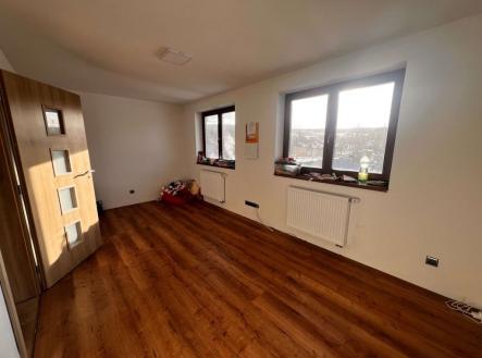 Jedná se o koncový řadový rodinný dům se 1.NP a provedenou vestavbou podkroví. V domě se nachází: v 1.NP: technická místnost – průjezd (11,90 m2), vstup (6,60 m2), koupelna s WC (6,44 m2), obývací pokoj s kk (37,10 m2), schodiště (4,45 m2) a dále v podkroví a zastřešení: chodba (11,65 m2), WC (1,82 m2), koupelna – nedokončená (6,61 m2), pokoj (14,83 m2), pokoj se šatnou (22,55 m2) a pokoj (10,58 m2). Podlaha je keramická a plovoucí vinyl a laminát, schodiště je betonové, okna dřevěná Eurookna. Vytápění je etážové napojené na krbovou vložku s výměníkem. Dům je napojen na přívod elektrické energie, přípojkou na vlastní studnu, na místní kanalizaci a na zemní plyn.