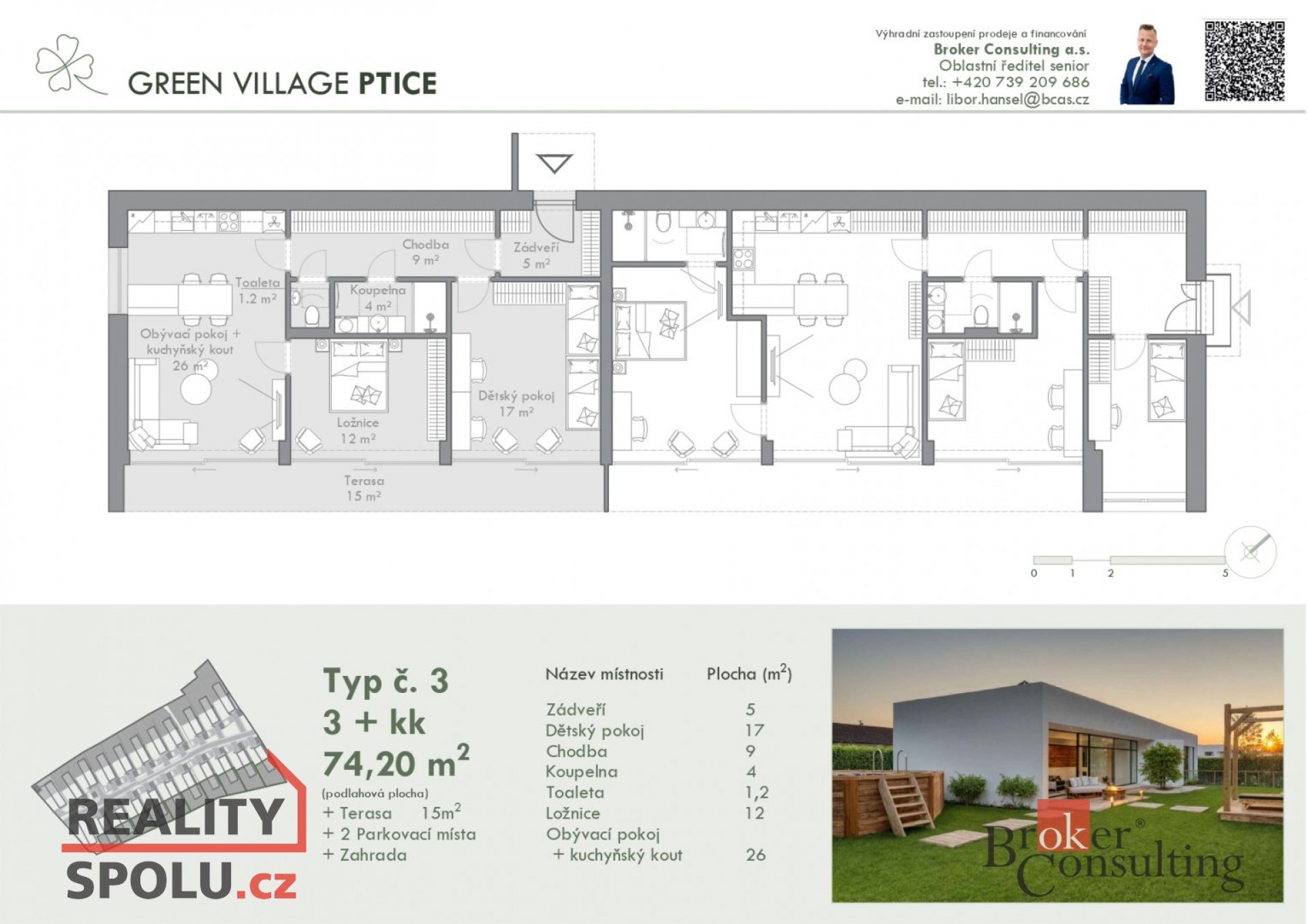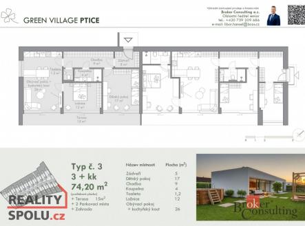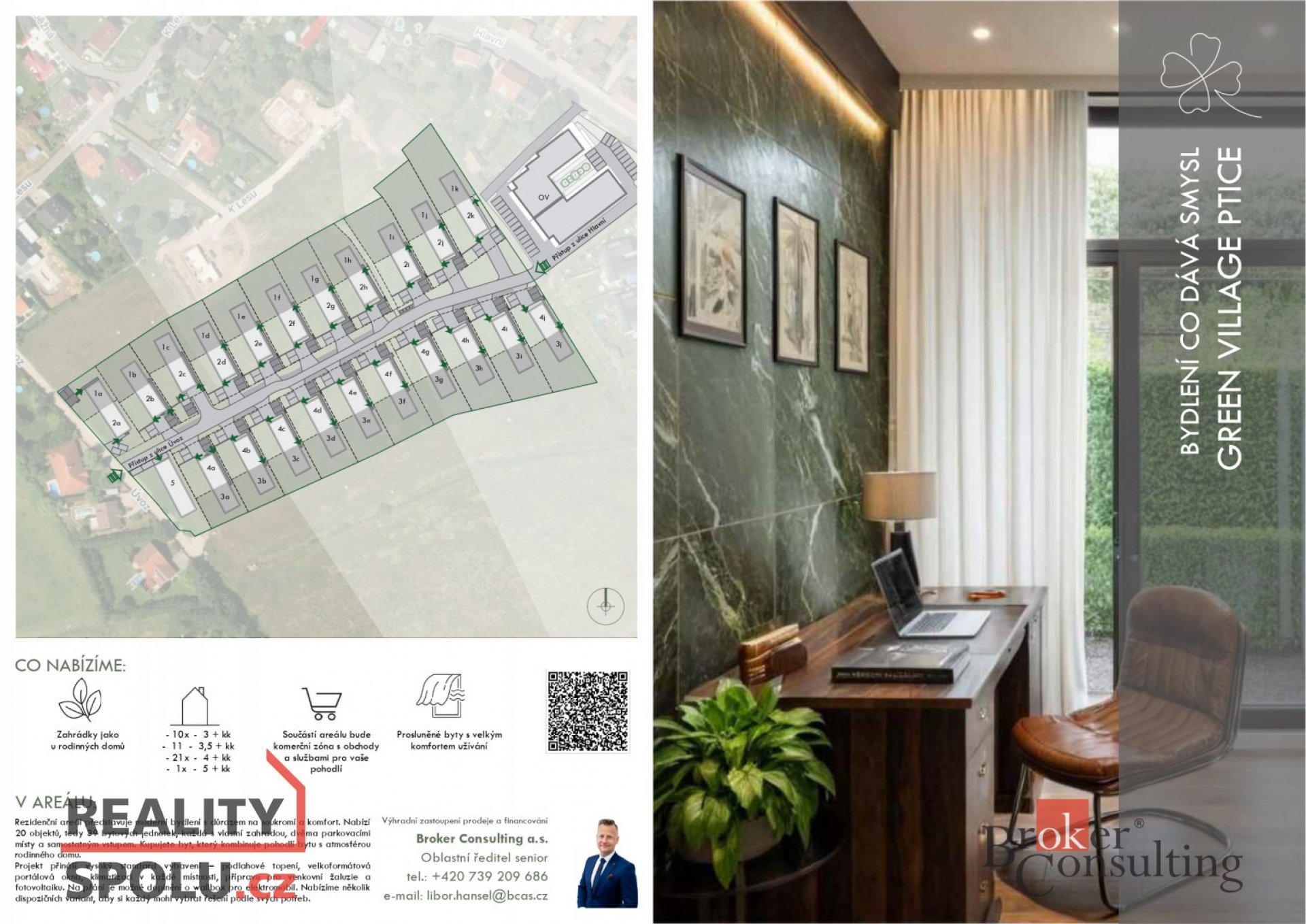 Nabízíme k prodeji bytové jednotky v rámci nového developerského projektu v malebné obci Ptice, která nabízí klidné bydlení v přírodě a zároveň velmi dobrou dostupnost do Prahy a okolních měst. Projekt zahrnuje 40 bytových jednotek o dispozicích 3+kk, 4+kk a 5+kk, umístěných v samostatně stojících novostavbách domů s vlastní zahradou a parkovacím stáním. Popis projektu: Fáze projektu: ve výstavbě, dokončení první etapy plánováno na srpen 2026 Typ domů: rodinné domy o jedné či dvou bytových jednotkách Rozměry domů: 8,375 × 28,650 m, konstrukce skeletový systém s dozdívkou Ytong, možnost i dřevostavby Zahrada a parkování: každá jednotka má vlastní zahradu a parkovací stání, ideální pro rodiny s dětmi nebo domácí mazlíčky Technické vybavení: napojení na inženýrské sítě (elektřina, pitná voda, kanalizace), vytápění elektrickými rohožemi, klimatizací, rekuperací a fotovoltaikou, dešťové vody likvidovány na pozemku Komplex a služby v okolí: projekt bude součástí uzavřeného komplexu s polyfunkčním domem obsahujícím kavárnu, sportovní obchod a potraviny Lokalita: Obec Ptice je známá svou příjemnou atmosférou, čistým prostředím a množstvím zeleně. V okolí najdete cyklostezky, lesy a možnosti pro volnočasové aktivity. Díky výborné dopravní dostupnosti do Prahy (vlakem i autem) je ideální pro ty, kteří chtějí spojit klidný život mimo ruch města s rychlým spojením do centra. Výhody projektu: Moderní a variabilní bytové jednotky se zahradou a parkováním Samostatně stojící domy umožňující soukromí a pohodlí Uzavřený komplex s vlastní infrastrukturou Klidná a zelená lokalita s dobrou dostupností do Prahy Tento projekt je ideální pro rodiny, páry nebo jednotlivce, kteří hledají komfortní bydlení v klidném prostředí s vlastním pozemkem a parkovacím stáním, přitom blízko města a občanské vybavenosti. Pro více informací nebo domluvení prohlídky nás kontaktujte.