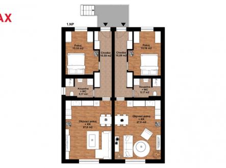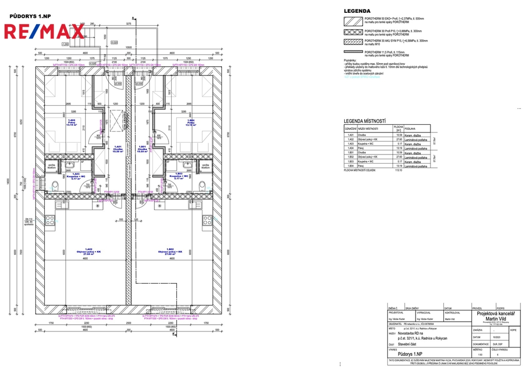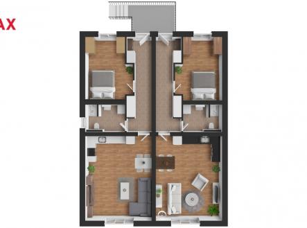 Nabízíme k prodeji novostavbu přízemního rodinného dvojdomu. Objekt je řešen jako samostatně stojící, se dvěma bytovými jednotkami o dispozici 2+kk a podlahové ploše cca 58 m² a součástí je sklep o velikosti cca 36 m², avšak je možné jej zakoupit i jako jeden celek – rodinný dům. V této fázi výstavby je navíc stále možnost úpravy dispozice dle individuálních požadavků budoucího majitele. Celková plocha pozemku činí 723 m², zastavěná plocha domu 156 m². V 1.NP se nachází kuchyň s obývacím pokojem, ložnice, koupelna, předsíň. V 1.PP je prostorný sklep pro každou bytovou jednotku s denním světlem, který lze využít i jako pracovnu či fitness. Součástí 1.PP je i technické zázemí pro bytové jednotky. Ke každému bytu patří zahrada a o celkové výměře 478 m2. Zahrada je ve společném vlastnictví dvojdomu a bude rozdělena ideální polovinou. Vytápění je řešeno teplovodním podlahovým topením napojeným na tepelné čerpadlo NIBE, součástí jsou 2 zásobníky TUV (2×125 l). Na střeše budou instalovány fotovoltaické panely o výkonu 30 kWp, což zajišťuje velmi úsporný provoz domu. Dvojdům spadá do energetické třídy A, což ho řadí mezi budovy s minimální náročností energie. Stavba je navržena jako zděná z keramických cihel POROTHERM (obvodové zdivo 300 mm, příčky 115 mm). Krov je z dřevěných vazníků, pultová střecha s plechovou falcovanou krytinou. Osazena budou plastová okna s trojskly, v exteriéru v barvě antracit, v interiéru bílá, doplněná o venkovní žaluzie. Vstupní dveře budou ve stejném barevném provedení. Podlahy obytných místností vinylové, v koupelně, na WC a v technické místnosti keramické dlažby. Pozemek bude oplocen pletivem a budou provedeny terénní úpravy. Zpevněné plochy budou ze zámkové a terasové dlažby. Cena zahrnuje kompletní realizaci domu – základovou desku, projektovou dokumentaci včetně stavebního povolení a poplatků, výstavbu domu, přípojky, kolaudaci, venkovní terénní úpravy, zpevněné plochy a oplocení pozemku. Momentálně je nemovitost v počáteční fázi výstavby s plánovaným dokončením zima 2026. Dům bude napojen na veřejný vodovod, kanalizaci a elektrickou síť. Podlahy, dveře, sanita, obklady – vše bude nové, velmi vkusně sladěné, v příjemných klidných tónech. Projekt nabízí prostor pro klientské změny a individuální úpravy podle přání budoucího majitele. Nemovitost se nachází na okraji obce a je ideálním řešením pro ty, kteří hledají kombinaci klidného bydlení s výhodami městské infrastruktury. Veškerá občanská vybavenost se nachází v obci (MŠ, ZŠ, obchody, krásná kavárna, zdravotní zařízení, hotel, restaurace, tenisové kurty atd.) Napojení severního Rokycanska na dálnici D5 bylo již dokončeno a momentálně jste v centru Plzně cca do 25 minut, na nájezd na dálnici směr Praha do 12 min. Pro více informací mě neváhejte kontaktovat, ráda s Vámi projdu projektovou dokumentaci a možnosti změn. Vizualizace jsou ilustrační.