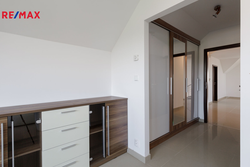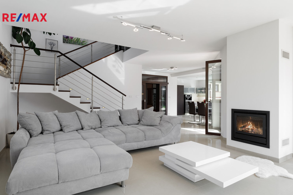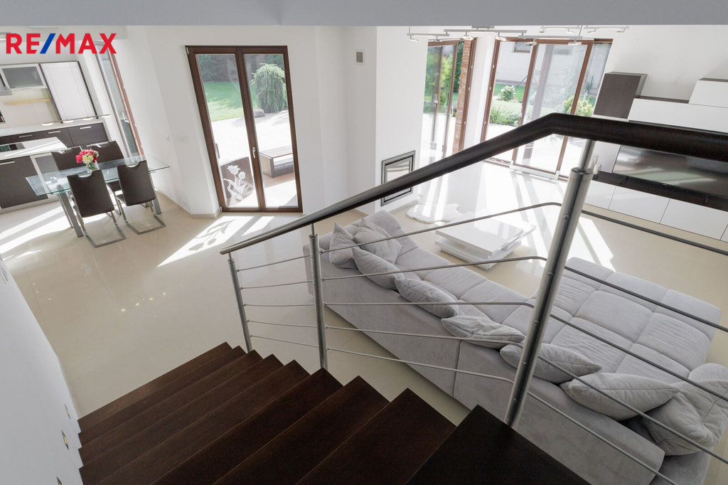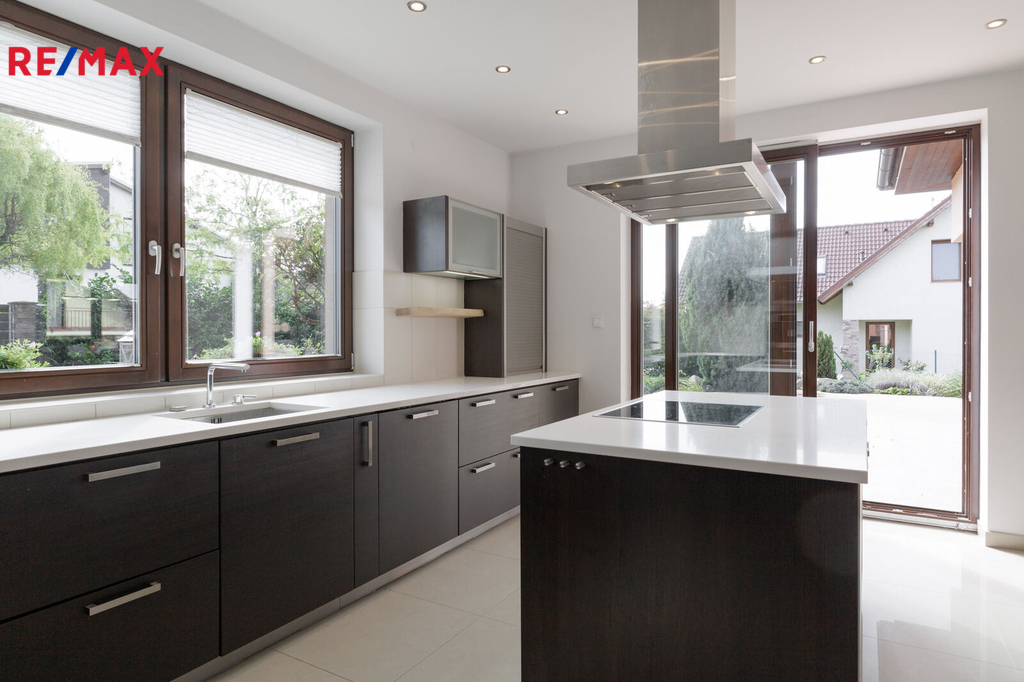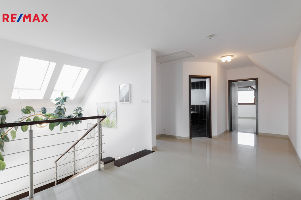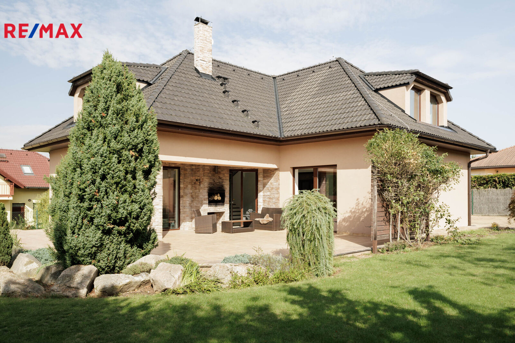 Nabízíme k prodeji velmi pěkný a prostorný rodinný dům v klidné lokalitě obce Strašín u Říčan. Přízemí: Dominantou celého domu je jeho přízemí. Kuchyň, která je do posledního detailu navržena nábytkem na míru zn. Sykora. Vestavěné spotřebiče zn. Miele jsou samozřejmostí, stejně jako zabudovaný kávovar. Ženy jistě ocení špajz, který ke kuchyni patří. K přízemí patří obývací pokoj s na míru vyrobenou obývací stěnou. Plynový krbe, Vás v chladnějších měsících nejen zahřeje, ale působí v celém prostoru skvěle. Velkou výhodou obývacího pokoje a kuchyně je vstup na terasu, kde můžete u venkovního grilu s komínem posedět s přáteli nebo rodinou, a něco dobrého připravit. Jako pokoj pro hosty nebo pracovna byl vymyšlen prostor, který se nachází u vstupu do domu. Součástí pokoje je šatna. Přízemí disponuje koupelnou se sprchovým koutem a WC. V technické místnosti najdete vše potřebné pro běžný chod domu. 1.Patro: Při stoupání do prvního patra se nám nabídne prostorná chodba se vstupy do 3 ložnic, z nichž jedna z nich lze rozdělit na dva samostatné pokoje. Součástí každé ložnice je šatna s úložným prostorem. V prvním patře najdeme další koupelnu, tentokrát s vanou i se sprchovým koutem, dále pak samostatné WC. Celý dům má podlahové vytápění, venkovní elektrické rolety a vnitřní rolety. Zahrada u domu je udržovaná pravidelně zahradníkem. Na zahradě je umístěn zavlažovací systém trávníku s nádrží na dešťovou vodu. Okna jsou dřevěná trojskla. Venkovní i garážová vrata jsou na elektrický pohon. Lokalita obce Strašín je vyhledávanou lokalitou. Nabízí vše potřebné pro běžný život. Pokud se Vám tento dům líbí, napište mi a velmi ráda Vás domem provedu.
