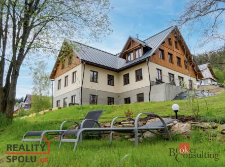 Luxusní apartmán 3+kk s dvěma koupelnami a parkovacím stáním Velmi vkusně zařízený a plně vybavený apartmán s nádherným výhledem v oblíbeném horském středisku Rokytnice nad Jizerou o celkové výměře 61 m2. Apartmán je kompletně dokončený a připravený a prodává se včetně veškerého stylového vybavení. K apartmánu náleží také vlastní parkovací stání přímo u domu. Hosté mohou zdarma využívat rozlehlou zahradu pod domem, kde se nachází bazén, prostor pro grilování a venkovní posezení. Kapacita tohoto apartmánu je až 7 osob. Dispozice je velmi praktická, lze oddělit na dvě samostatné jednotky s vlastním vchodem. Obě ložnice mají každá vlastní koupelnu, v obývacím pokoji je kompletně vybavená kuchyň včetně spotřebičů a nádobí, jídelní stůl s židlemi a rozkládací pohovka. Tato nemovitost je ideální pro využití kombinace rekreace s výdělkem z krátkodobých pronájmů. O obsazenost včetně servisu se mohou postarat vlastníci, kteří zatím v domě trvale bydlí a spravují i ostatní ubytovací jednotky. Aktuálně připravujeme do prodeje další 3 jednotky, v cenovém rozpětí od 3,2 do 7 milionů korun, rádi Vám všechny osobně představíme a pomůžeme s výběrem. Dům se nachází u málo frekventované i v zimě udržované silnice, v blízkosti skiareálu Studenov. Autem či skibusem se snadno dostanete jak na Horní domky, tak do dalších lyžařských skiareálů v okolí, včetně Harrachova a mnoha dalších lyžařských středisek. V Rokytnici nad Jizerou najdete širokou občanskou vybavenost - je zde mnoho restaurací, obchodů, lyžařských škol a půjčoven, sportovní hala s tenisovými kurty a tělocvičnami, kuželna. Rokytnice je vyhledávanou lokalitou nejen pro sjezdové lyžaře – nabízí také upravené běžecké tratě, ideální terény pro skialpinismus, krásnou přírodu pro pěší turistiku a v létě skvělé podmínky pro cyklistiku. V letní sezóně jezdí na Zlaté návrší cyklobus. V případě zájmu s Vámi rádi probereme možnosti financování. Přijďte se podívat, toto místo si zamilujete. Rádi Vám tuto nadstandardní nemovitost ukážeme osobně. Těšíme se na Vás.
