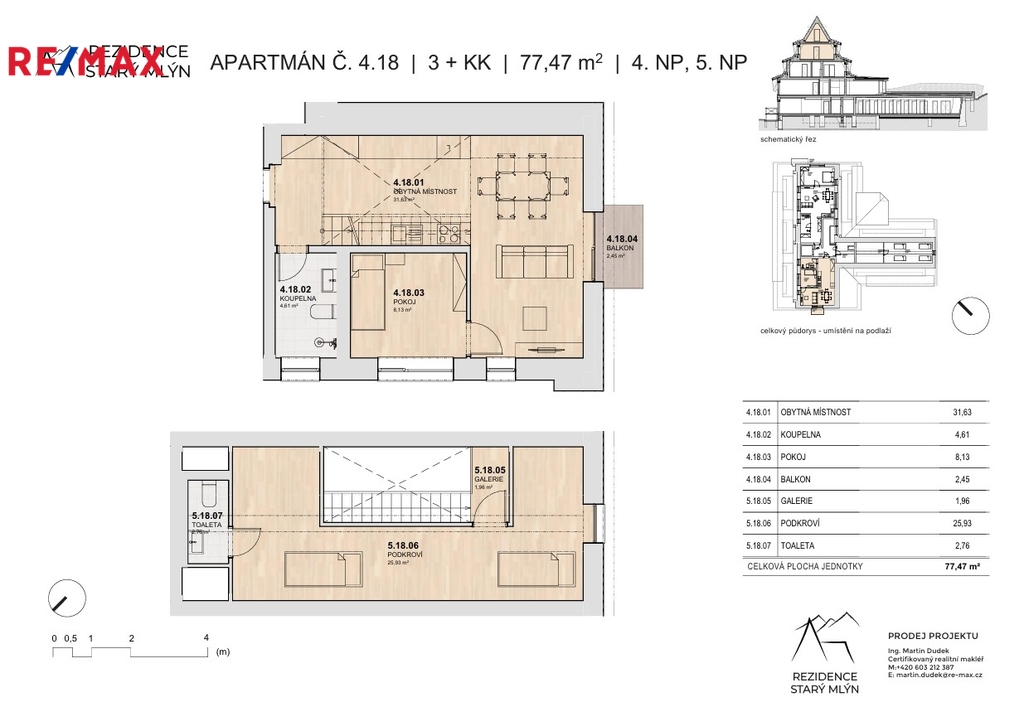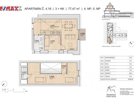 Rezidence Starý Mlýn nabízí exkluzivní horské apartmány v krásném a klidném prostředí Rokytnice nad Jizerou. Rezidence nabízí 19 moderních jednotek o dispozicích 1KK až 3KK s možností výběru balkonů či teras umožňující bezprostřední propojení s okolní krajinou a úchvatnými výhledy na panoramata hor. Naše apartmány nabízí styl, kvalitu a komfort s využitím moderních technologií. Ke každému apartmánu náleží vlastní uzamykatelná kolárna-lyžárna a parkovací stání. Komplex nabízí společné wellness (rezervační smart systém privátní sauny). Samozřejmostí je výtah. Prezentovaný mezonetový apartmán č. 18 o dispozici 3+KK se nachází ve třetím a čtvrtém patře (4+5 NP) a disponuje podlahovou plochou 75 m² + balkonem (2,45 m2). Jednotku tvoří prostorný obývací pokoj s kuchyňskou linkou a balkonem, samostatným pokojem, samostatnou koupelnou a v dalším podlaží (5NP) samostatnou ložnicí s toaletou. K jednotce náleží balkon o velikosti 2,44 m2, který umožňuje relaxaci s výhledem na okolní přírodu. K jednotce náleží náleží privátní uzamykatelná kolárna + lyžárna, parkovací stání a možnost využívat společného wellness. Cena za apartmán je uváděna včetně parkovacího stání (v hodnotě 400tis Kč) a DPH s možností odpočtu ve výši 21%. Aktuálně nabízíme k tomuto apartmánu voucher na kuchyňskou linku v hodnotě 200 tis Kč. Stavba byla již zahájena a plánované dokončení je v počátku roku 2027. Sjezdovky jsou dosažitelné během několika minut, turistické a cyklotrasy začínající přímo před vašim apartmánem. Dostupnost z Prahy je cca 1,5 hodiny a z Liberce je cca 1hodinu. Celoroční provoz zajišťuje stálý výnos i maximální využitelnost pro vás nebo vaše hosty. V případě potřeby zajistíme také profesionální financování nákupu nemovitosti. Pro více informací a domluvení prohlídky mě kdykoliv kontaktujte.