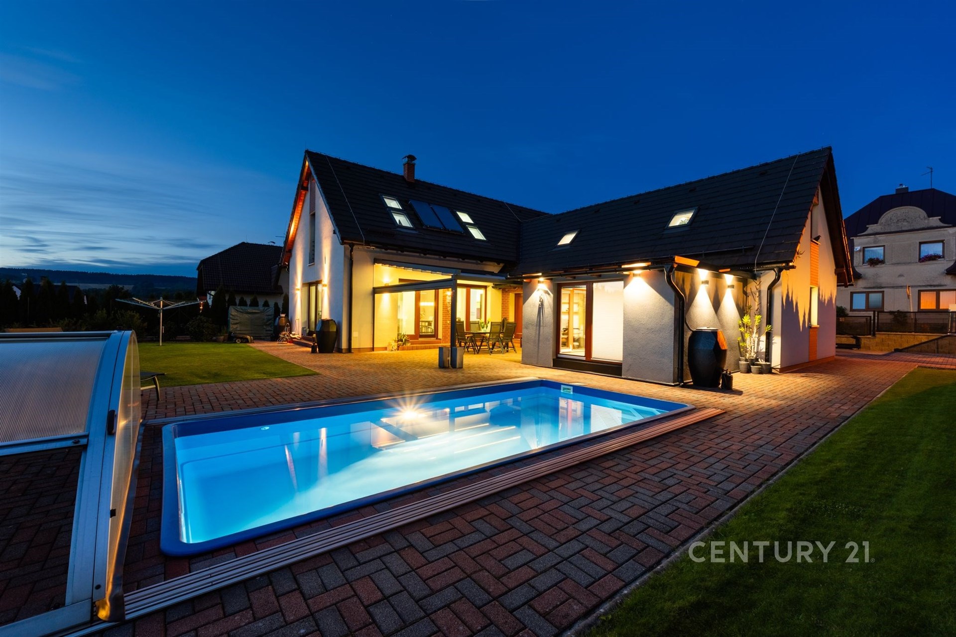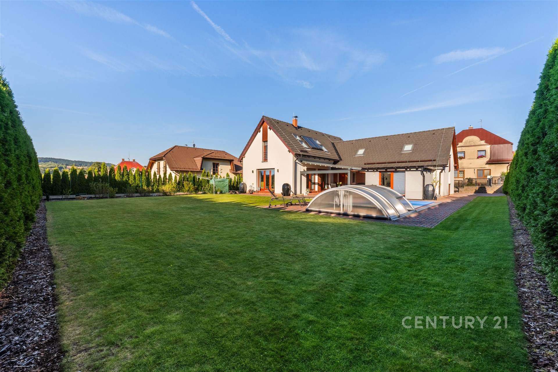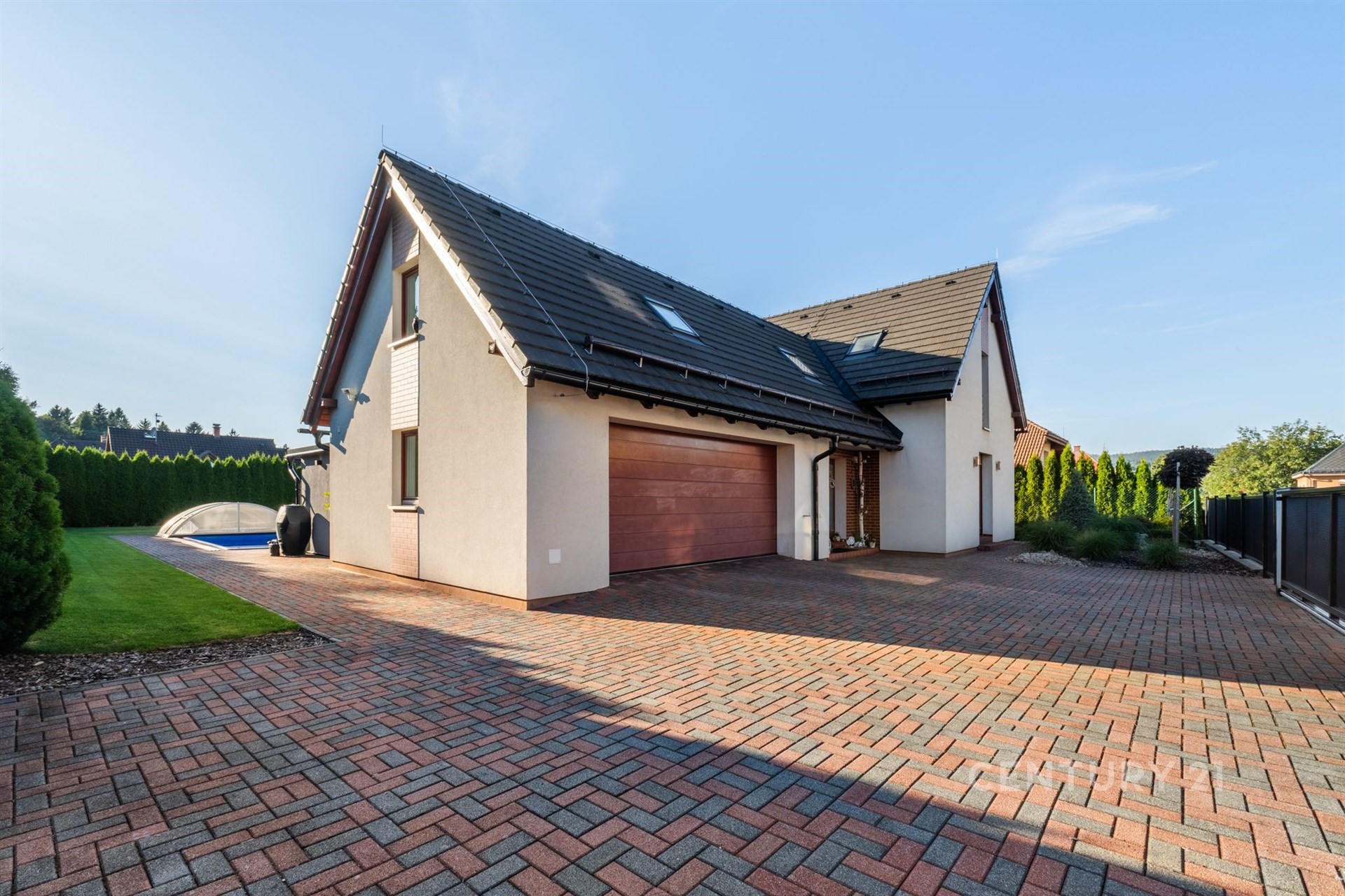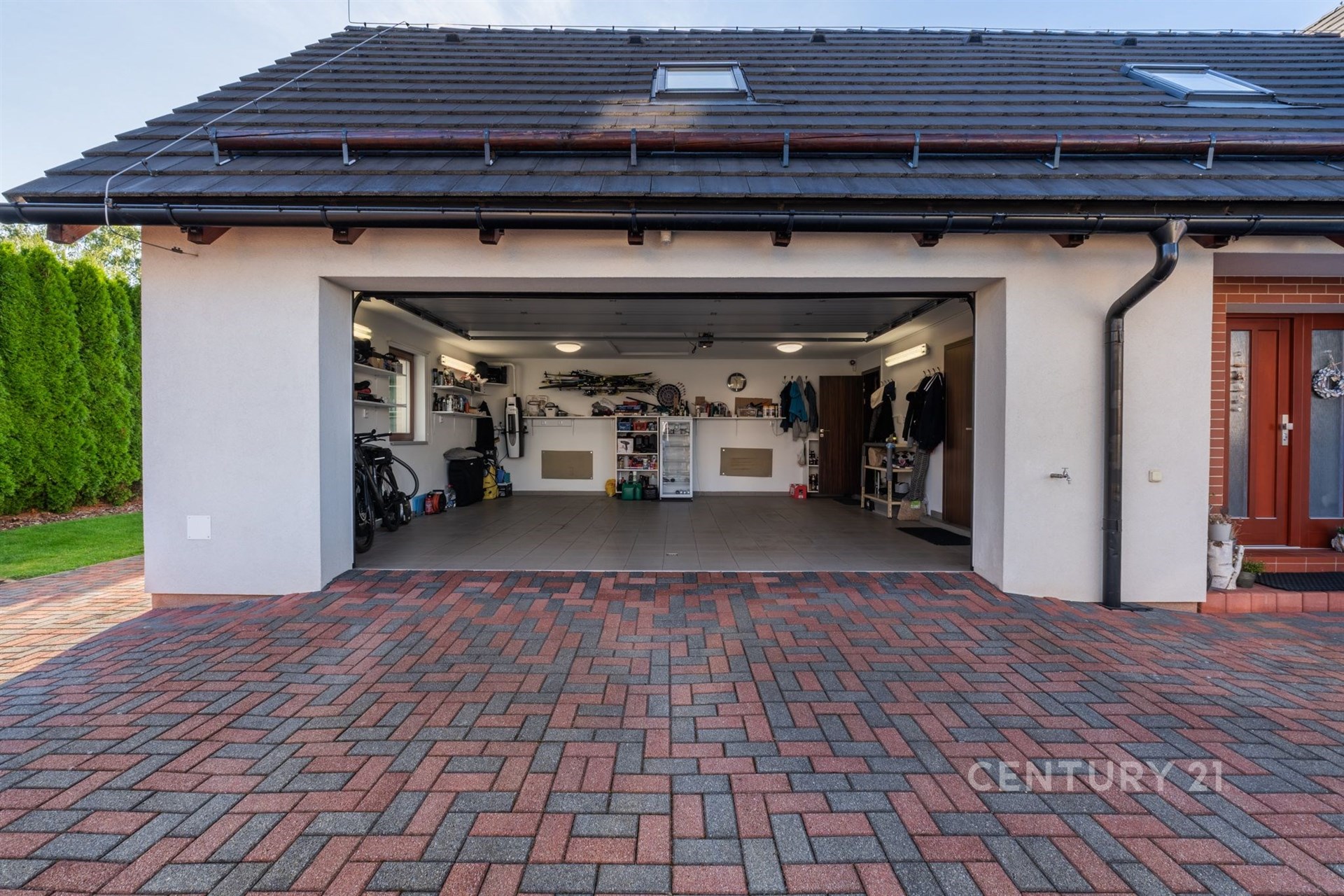 Hledáte domov, který nabídne dostatek prostoru, moderní technologie a klidné rodinné zázemí? Moderní rodinný dům na prestižní adrese Sokolská 872 v Rychnově u Jablonce nad Nisou splní vše, co od vysněného bydlení očekáváte. Tato výjimečná nemovitost, postavená v roce 2011, nabízí nadstandardní bydlení na krásném rovinatém pozemku o výměře 966 m² a splňuje veškeré nároky na komfortní rodinný život. Dům disponuje celkovou užitnou plochou 209 m², rozdělenou do dvou nadzemních podlaží. V přízemí Vás přivítá prostorný obývací pokoj s jídelnou (42,5 m²) a přímým vstupem na terasou o velikosti 31,3 m², která poskytuje výhled na zahradu s krytým zapuštěným bazénem se slanou vodou – ideálním místem pro letní grilování a rodinné oslavy. Na terasu navazuje samostatný pokoj (15,8 m²) vhodný jako pokoj pro hosty či pracovna. Součástí přízemí je dále kuchyň se spíží, koupelna se sprchovým koutem, pokoj (13,65 m²), technická místnost a prostorná garáž (35,75 m²) se dvěma parkovacími místy a nabíječkou pro elektromobil. Na pozemku je navíc možné zaparkovat až čtyři další vozy. Horní patro přináší klidnou atmosféru a soukromí pro každého člena rodiny. Najdete zde tři útulné ložnice, kde si každý člen rodiny vytvoří svůj vlastní prostor. Prostorná koupelna s vanou nabízí místo pro relaxaci po náročném dni. Velkorysý pokoj o rozloze přes 30 m² pak otevírá široké možnosti využití – může se proměnit v domácí pracovnu, posilovnu, hernu pro děti nebo třeba ateliér. Celé patro působí světlým a vzdušným dojmem a poskytuje harmonické zázemí pro rodinný život. Nemovitost je vybavena moderními technologiemi – solárními panely, tepelným čerpadlem, centrálním vysavačem Electrolux, trezorem a alarmovým systémem proti vniknutí. Energetická náročnost domu spadá do kategorie C, což znamená úspornější provoz. Exteriér domu je navržen s důrazem na praktičnost i komfort: jímka na dešťovou vodu sloužící k zalévání zahrady a ovocných keřů, venkovní žaluzie, čtyři bezpečnostní kamery se systémem Eufy (ovládání v češtině), vytápěné žlaby a okapy proti sněhu, automatická sekačka Husqvarna a vysavač do bazénu. Dům se prodává plně vybavený, což zajišťuje okamžitý komfort a pohodlné nastěhování bez dalších investic. Rychnov u Jablonce nad Nisou je vyhledávaným městem s kompletní občanskou vybaveností, ideálním pro rodiny s dětmi i aktivní životní styl. Najdete zde mateřskou i základní školu, dětská hřiště, obchody, restaurace, poštu, zdravotní středisko i sportoviště. Okolí je obklopeno krásnou přírodou Jizerských hor, která láká k turistice, cyklistice a v zimě k lyžování. Díky tomu si zde najde každý to své – od pohodového rodinného života až po aktivní trávení volného času. Výborná je i dopravní dostupnost – Jablonec nad Nisou je vzdálen 10 minut, Liberec 12 minut a Praha Černý Most přibližně 50 minut. Tento dům je skvělou volbou pro ty, kteří hledají kombinaci moderní architektury, chytrých technologií, nadstandardního vybavení a klidné lokality s výbornou dostupností.