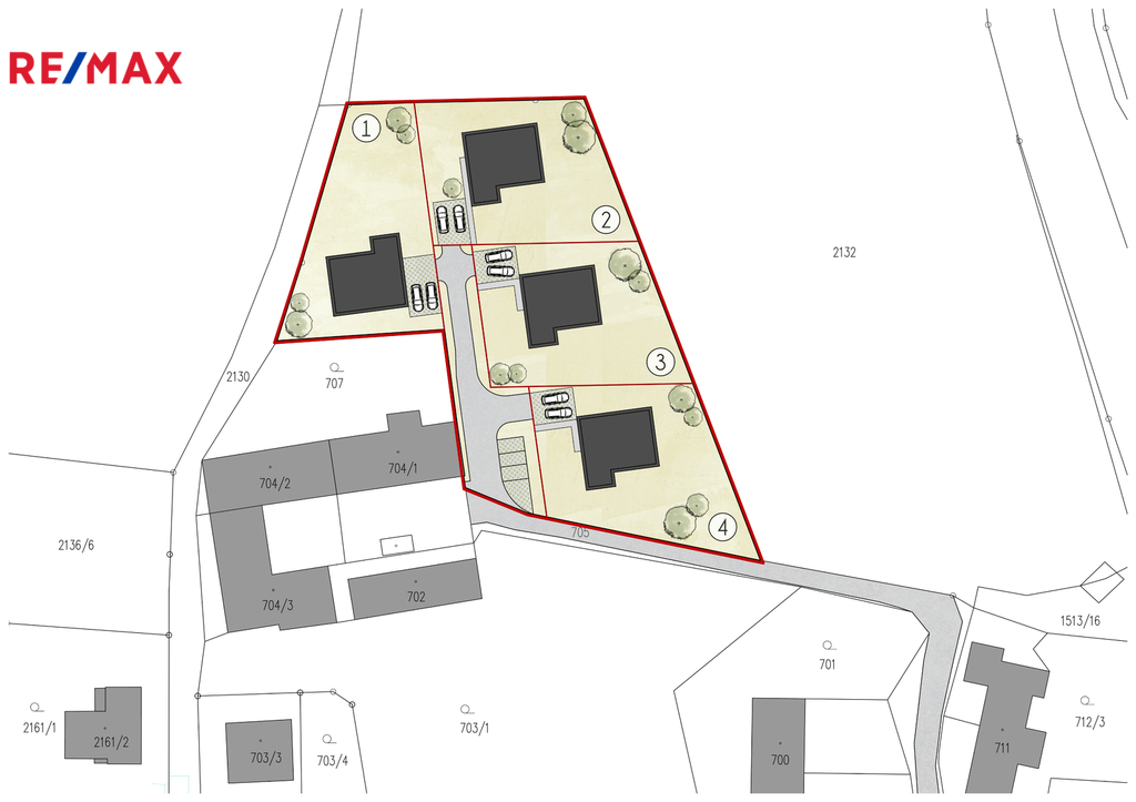 Stavební parcela rozdělena na 4 samostatné pozemky s celkovou výměro 4179 m2