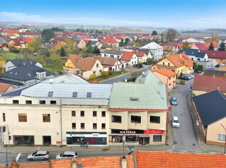 Nabízíme k prodeji velmi zajímavý objekt se dvěma velkými byty, dvěma nebytovými prostory a potenciálem půdního prostoru v Sezemicích. Obec má velmi dobré napojení na dálnici D35. Prodávaný dům se nachází v centru města. Jedná se o dvoupodlažní dům, který je z velké části podsklepený a je s původní vestavbou se sedlovou střechou. V 1NP jsou nebytové prostory, ve 2NP jsou umístěny prostorné byty. Půdní prostor je prázdný, nevyužitý, nabízí potenciál krásného podkrovního bydlení. V suterénu se nachází sklep s několika místnostmi. 1PP (sklep) disponuje 4 místnostmi o podlahové ploše 105 m², každá místnost má plastová okna. Sklep má 2 přístupová schodiště. Sklep je po kompletní rekonstrukci. Stropy nad sklepem jsou železobetonové. V 1NP je rozdělené na dva nebytové prostory, skladové prostory, chodbu a 2x WC. V jednom nebytovém prostoru o ploše 89 m² byly umístěny kanceláře následně prodejna barev a laků. Prostor je napojen na samostatnou plynovou přípojku s možností vytápění plynovým kotlem. Prostor má samostatné WC a sklad. Výlohy jsou zde po celkové renovaci, okna plastová. V druhém nebytovém prostoru je rychlé občerstvení Kebab (34 m²).Tento prostor je samostatně podsklepený a disponuje samostatným WC. Je zde zaveden a samostatná plynová přípojka. Obě prodejny mají přístup z domu a z hlavní ulice. Ve 2NP se nachází dvě velké bytové jednotky o dispozici mezonetový 4+1 (98,5 m²), 3+1 (86 m²). Byt 4+1/3+1 (mezonet), prošel postupně kompletní renovací včetně rozvodů elektřiny, vody, odpadů a výměny oken za plastová. Byt je orientovaný do Jungmannovy ulice na V stranu a okno v kuchyni, koupelně má na západ. Vytápění bytu a ohřev vody jsou zajištěny plynovým kotlem. Mimo ústředního topení byt disponuje krbovou vložkou v obývacím pokoji. Na podlahách je dlažba (chodba, kuchyň, jídelna, koupelna), dřevěná podlaha – obývací pokoj, ložnice, oba pokoje ve 3 NP betonová podlaha. V kuchyni a v jídelně je podlaha vytápěná. V 2NP se nachází kuchyň, jídelna, obývací pokoj, ložnice, komora, koupelna a ve 3NP 2 pokoje, šatní místnost, WC a terasa. Byt ve 3NP byl původně samostatným bytem a nyní je propojen točitým schodištěm. Byt 3+1 prošel částečnou renovací (rozvody elektřiny jsou provedeny v mědi, plastová okna). Je orientovaný na J a V stranu (do Jungmannovy ulice a do Havlíčkovy ulice). Byt je vytápěn plynovým kotlem, voda je ohřívána el. bojlerem. Na podlaze v bytě jsou parkety, na nich jsou položeny koberce, v kuchyni linoleum, v chodbě leštěná žula. Oba byty jsou vhodné k nastěhování. Ve 3NP je půda, která nabízí další možné rozšíření o bytové jednotky. Půdní prostor je o podlahové ploše cca 164 m². V roce 2018 byla kompletně zrenovovaná střecha vč. Provedení vnějšího nátěru a výměny okapů. U Z a V stěn bylo provedeno zateplení a fasáda. Dům je napojen na městskou vodu, elektřinu, plyn. Odpadní voda je svedena do kanalizace. Nebytový prostor (barvy laky) v 1 NP + byt v 2 NP jsou vybaveny ESP s možností napojení na PCO.