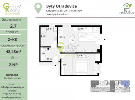 Ve výhradním zastoupení si Vás dovolujeme oslovit nabídkou moderní bytové jednotky o dispozici 2+KK a celkové užitné ploše 51,1 m², která se nachází v kompletně zrekonstruovaném bytovém domě v obci Otradovice – Skorkov pouhých 5 minut od Brandýsa nad Labem – Staré Boleslavi. Projekt Byty Otradovice zahrnuje celkem 16 bytových jednotek různých velikostí a nabízí kvalitní a komfortní bydlení v klidné lokalitě s výbornou dostupností do Prahy, Brandýsa nad Labem – Staré Boleslavi i Mladé Boleslavi. Součástí kupní ceny je parkovací stání před domem, kuchyňská linka vyrobená na míru od truhláře včetně vestavných spotřebičů, kompletní sanita v koupelně značky JIKA a zděný sklep o minimální ploše 15 m² umístěný v suterénu domu. Byty jsou navrženy s důrazem na moderní standardy a praktické využití prostoru. Samozřejmostí je podlahové vytápění napojené na tepelné čerpadlo voda–vzduch, digitální Wi-Fi termostat, vinylové podlahy v dekoru dřeva a sádrokartonové podhledy s vestavěným osvětlením, velkoformátová dlažba a obklady v koupelně. Okna s trojskly ve dvojím dekoru. Interiérové dveře včetně kování značky SAPELI doplňují bezpečnostní protipožární vstupní dveře. V koupelnách bytových jednotek kompletní sanita se skleněným sprchovým koutem a topným žebříkem a přípravou pro pračku i sušičku. U bytového domu pro majitele bytových jednotek k dispozici nabíječka na elektroauta a venkovní mycí box pro kola. Dokončení projektu je plánováno na prosinec 2026. Již od února 2026 bude k dispozici plně vybavený vzorový byt, který si bude možné osobně prohlédnout. Přiložené vizualizace mají orientační charakter a zhotovitel usiluje o to, aby se výsledná realizace co nejvíce shodovala s jejich podobou. Bytový dům je situován v přírodě, obklopen lesy, a poskytuje tak příjemné a klidné prostředí pro život. Sousední skladový areál bude navíc odstíněn přírodní zelenou zástěnou, jak je patrné z přiložených vizualizací. Byty Otradovice představují ideální příležitost pro ty, kteří hledají moderní bydlení v zeleni s rychlou dostupností města, ať už pro vlastní potřebu, nebo jako zajímavou investici. Pro více informací či sjednání prohlídky nás neváhejte kontaktovat. (PENB – C)