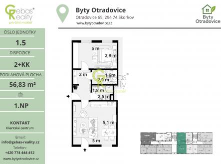 Ve výhradním zastoupení si Vás dovolujeme oslovit nabídkou moderní bytové jednotky o dispozici 2+KK a celkové užitné ploše 59,2 m², která se nachází v kompletně zrekonstruovaném bytovém domě v obci Otradovice – Skorkov pouhých 5 minut od Brandýsa nad Labem – Staré Boleslavi. Projekt Byty Otradovice zahrnuje celkem 16 bytových jednotek různých velikostí a nabízí kvalitní a komfortní bydlení v klidné lokalitě s výbornou dostupností do Prahy, Brandýsa nad Labem – Staré Boleslavi i Mladé Boleslavi. Součástí kupní ceny je parkovací stání před domem, kuchyňská linka vyrobená na míru od truhláře včetně vestavných spotřebičů, kompletní sanita v koupelně značky JIKA a zděný sklep o minimální ploše 15 m² umístěný v suterénu domu. Byty jsou navrženy s důrazem na moderní standardy a praktické využití prostoru. Samozřejmostí je podlahové vytápění napojené na tepelné čerpadlo voda–vzduch, digitální Wi-Fi termostat, vinylové podlahy v dekoru dřeva a sádrokartonové podhledy s vestavěným osvětlením, velkoformátová dlažba a obklady v koupelně. Okna s trojskly ve dvojím dekoru. Interiérové dveře včetně kování značky SAPELI doplňují bezpečnostní protipožární vstupní dveře. V koupelnách bytových jednotek kompletní sanita se skleněným sprchovým koutem a topným žebříkem a přípravou pro pračku i sušičku. U bytového domu pro majitele bytových jednotek k dispozici nabíječka na elektroauta a venkovní mycí box pro kola. Dokončení projektu je plánováno na prosinec 2026. Již od února 2026 bude k dispozici plně vybavený vzorový byt, který si bude možné osobně prohlédnout. Přiložené vizualizace mají orientační charakter a zhotovitel usiluje o to, aby se výsledná realizace co nejvíce shodovala s jejich podobou .Bytový dům je situován v přírodě, obklopen lesy, a poskytuje tak příjemné a klidné prostředí pro život. Sousední skladový areál bude navíc odstíněn přírodní zelenou zástěnou, jak je patrné z přiložených vizualizací. Byty Otradovice představují ideální příležitost pro ty, kteří hledají moderní bydlení v zeleni s rychlou dostupností města, ať už pro vlastní potřebu, nebo jako zajímavou investici. Pro více informací či sjednání prohlídky nás neváhejte kontaktovat. (PENB – C)