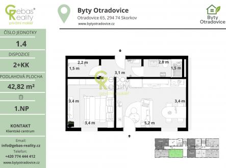 Ve výhradním zastoupení si Vás dovolujeme oslovit nabídkou moderní bytové jednotky o dispozici 2+KK a celkové užitné ploše 45,5 m², která se nachází v kompletně zrekonstruovaném bytovém domě v obci Otradovice – Skorkov pouhých 5 minut od Brandýsa nad Labem – Staré Boleslavi. Projekt Byty Otradovice zahrnuje celkem 16 bytových jednotek různých velikostí a nabízí kvalitní a komfortní bydlení v klidné lokalitě s výbornou dostupností do Prahy, Brandýsa nad Labem – Staré Boleslavi i Mladé Boleslavi. Součástí kupní ceny je parkovací stání před domem, kuchyňská linka vyrobená na míru od truhláře včetně vestavných spotřebičů, kompletní sanita v koupelně značky JIKA a zděný sklep o minimální ploše 15 m² umístěný v suterénu domu. Byty jsou navrženy s důrazem na moderní standardy a praktické využití prostoru. Samozřejmostí je podlahové vytápění napojené na tepelné čerpadlo voda–vzduch, digitální Wi-Fi termostat, vinylové podlahy v dekoru dřeva a sádrokartonové podhledy s vestavěným osvětlením, velkoformátová dlažba a obklady v koupelně. Okna s trojskly ve dvojím dekoru. Interiérové dveře včetně kování značky SAPELI doplňují bezpečnostní protipožární vstupní dveře. V koupelnách bytových jednotek kompletní sanita se skleněným sprchovým koutem a topným žebříkem a přípravou pro pračku i sušičku. U bytového domu pro majitele bytových jednotek k dispozici nabíječka na elektroauta a venkovní mycí box pro kola. Dokončení projektu je plánováno na prosinec 2026. Již od února 2026 bude k dispozici plně vybavený vzorový byt, který si bude možné osobně prohlédnout.Přiložené vizualizace mají orientační charakter a zhotovitel usiluje o to, aby se výsledná realizace co nejvíce shodovala s jejich podobou . Bytový dům je situován v přírodě, obklopen lesy, a poskytuje tak příjemné a klidné prostředí pro život. Sousední skladový areál bude navíc odstíněn přírodní zelenou zástěnou, jak je patrné z přiložených vizualizací. Byty Otradovice představují ideální příležitost pro ty, kteří hledají moderní bydlení v zeleni s rychlou dostupností města, ať už pro vlastní potřebu, nebo jako zajímavou investici. Pro více informací či sjednání prohlídky nás neváhejte kontaktovat. (PENB – C)