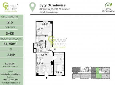 Ve výhradním zastoupení si Vás dovolujeme oslovit nabídkou moderní bytové jednotky o dispozici 3+KK a celkové užitné ploše 57,1 m², která se nachází v kompletně zrekonstruovaném bytovém domě v obci Otradovice – Skorkov pouhých 5 minut od Brandýsa nad Labem – Staré Boleslavi. Projekt Byty Otradovice zahrnuje celkem 16 bytových jednotek různých velikostí a nabízí kvalitní a komfortní bydlení v klidné lokalitě s výbornou dostupností do Prahy, Brandýsa nad Labem – Staré Boleslavi i Mladé Boleslavi. Součástí kupní ceny je parkovací stání před domem, kuchyňská linka vyrobená na míru od truhláře včetně vestavných spotřebičů, kompletní sanita v koupelně značky JIKA a zděný sklep o minimální ploše 15 m² umístěný v suterénu domu. Byty jsou navrženy s důrazem na moderní standardy a praktické využití prostoru. Samozřejmostí je podlahové vytápění napojené na tepelné čerpadlo voda–vzduch, digitální Wi-Fi termostat, vinylové podlahy v dekoru dřeva a sádrokartonové podhledy s vestavěným osvětlením, velkoformátová dlažba a obklady v koupelně. Okna s trojskly ve dvojím dekoru. Interiérové dveře včetně kování značky SAPELI doplňují bezpečnostní protipožární vstupní dveře. V koupelnách bytových jednotek kompletní sanita se skleněným sprchovým koutem a topným žebříkem a přípravou pro pračku i sušičku. U bytového domu pro majitele bytových jednotek k dispozici nabíječka na elektroauta a venkovní mycí box pro kola. Dokončení projektu je plánováno na prosinec 2026. Již od února 2026 bude k dispozici plně vybavený vzorový byt, který si bude možné osobně prohlédnout. Přiložené vizualizace mají orientační charakter a zhotovitel usiluje o to, aby se výsledná realizace co nejvíce shodovala s jejich podobou .Bytový dům je situován v přírodě, obklopen lesy, a poskytuje tak příjemné a klidné prostředí pro život. Sousední skladový areál bude navíc odstíněn přírodní zelenou zástěnou, jak je patrné z přiložených vizualizací. Byty Otradovice představují ideální příležitost pro ty, kteří hledají moderní bydlení v zeleni s rychlou dostupností města, ať už pro vlastní potřebu, nebo jako zajímavou investici. Pro více informací či sjednání prohlídky nás neváhejte kontaktovat. (PENB – C)