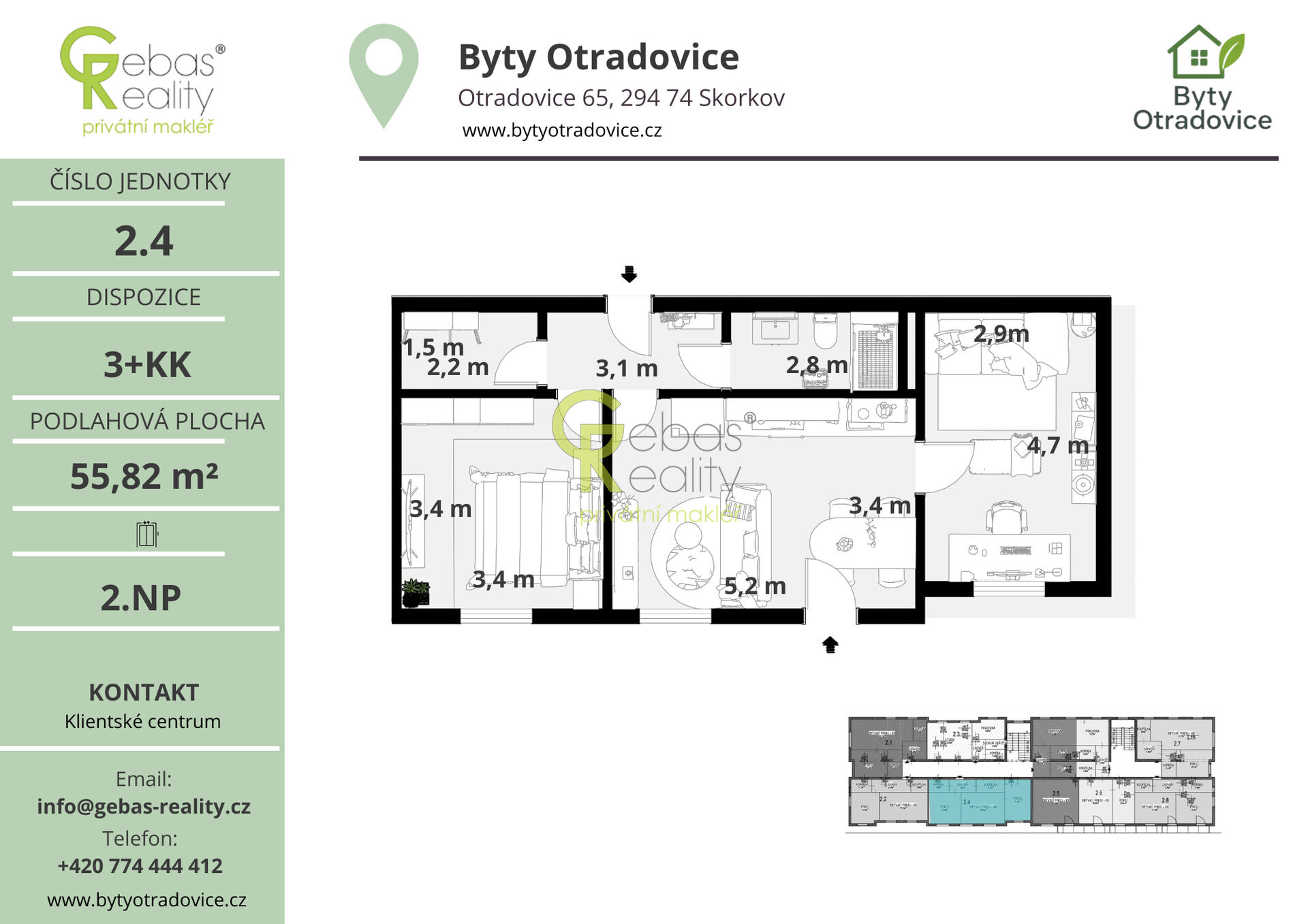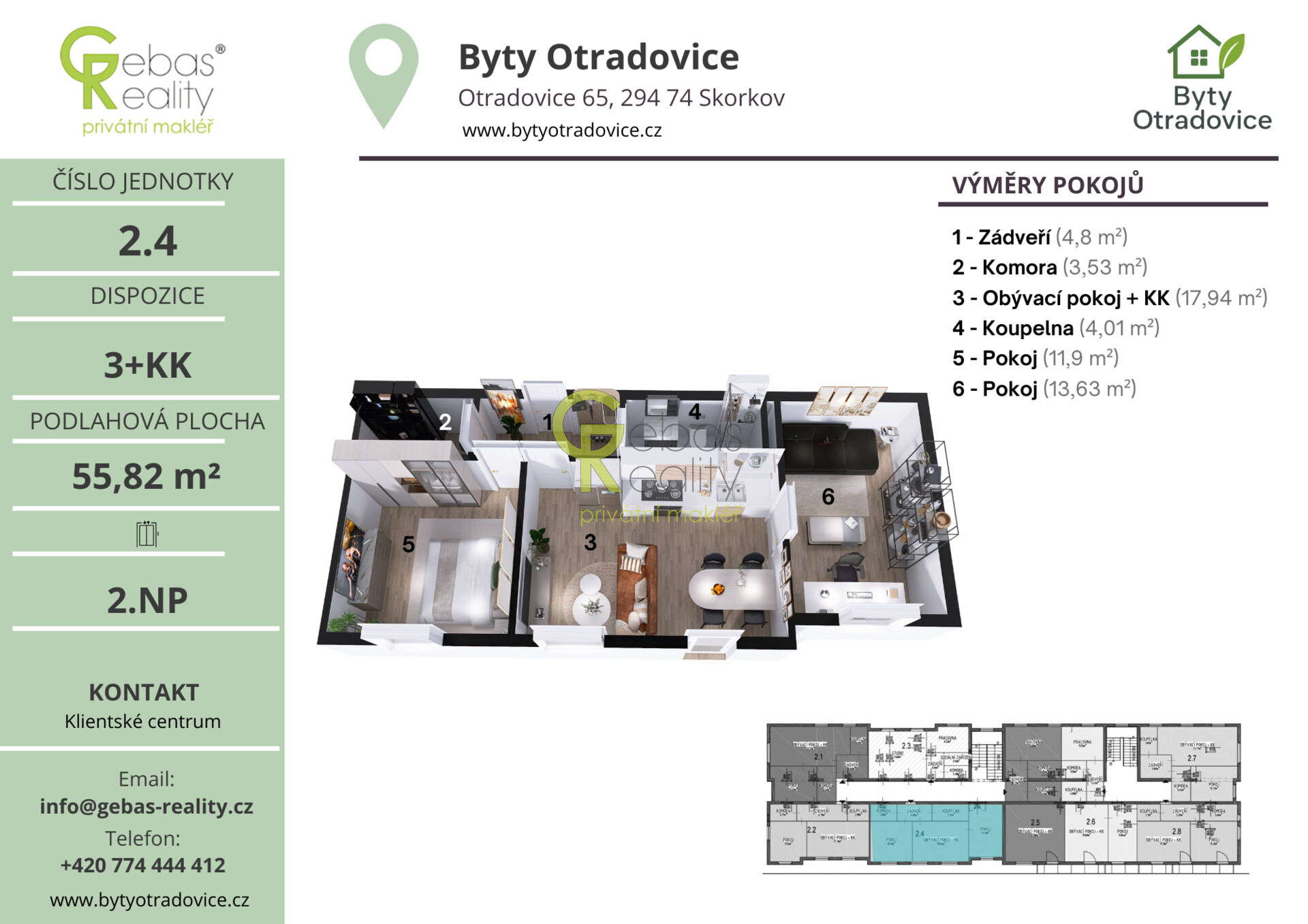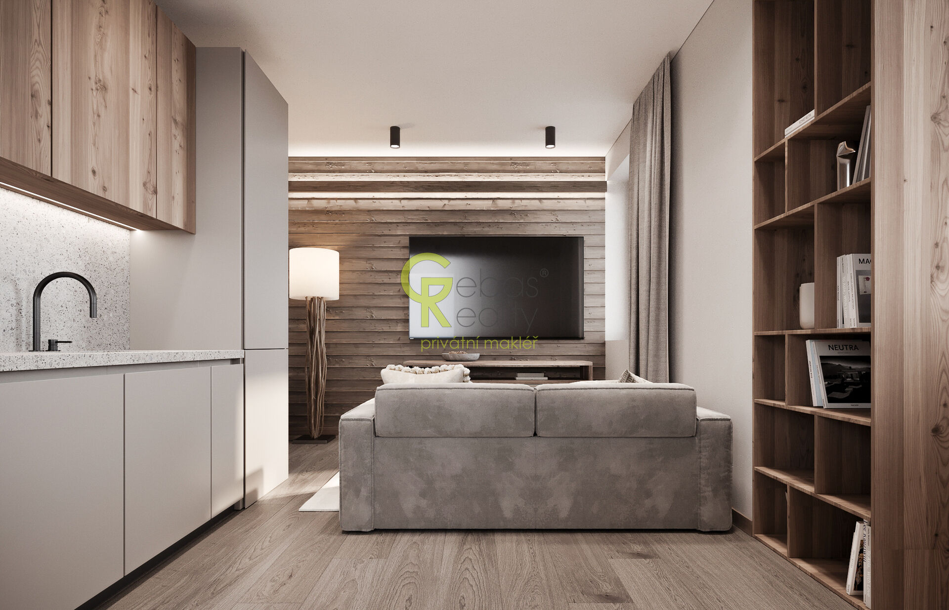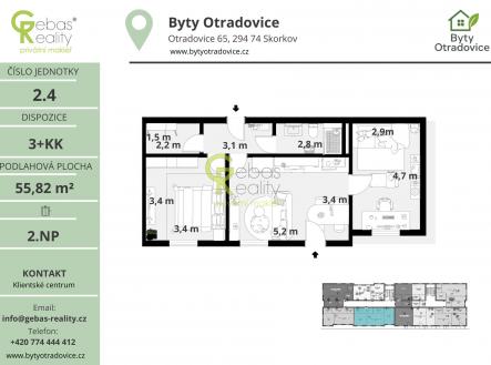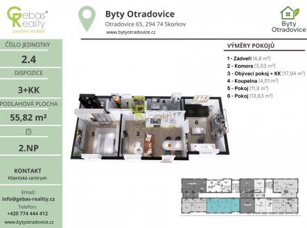 Ve výhradním zastoupení si Vás dovolujeme oslovit nabídkou moderní bytové jednotky o dispozici 3+KK a celkové užitné ploše 58,7m², která se nachází v kompletně zrekonstruovaném bytovém domě v obci Otradovice – Skorkov pouhých 5 minut od Brandýsa nad Labem – Staré Boleslavi. Projekt Byty Otradovice zahrnuje celkem 16 bytových jednotek různých velikostí a nabízí kvalitní a komfortní bydlení v klidné lokalitě s výbornou dostupností do Prahy, Brandýsa nad Labem – Staré Boleslavi i Mladé Boleslavi. Součástí kupní ceny je parkovací stání před domem, kuchyňská linka vyrobená na míru od truhláře včetně vestavných spotřebičů, kompletní sanita v koupelně značky JIKA a zděný sklep o minimální ploše 15 m² umístěný v suterénu domu. Byty jsou navrženy s důrazem na moderní standardy a praktické využití prostoru. Samozřejmostí je podlahové vytápění napojené na tepelné čerpadlo voda–vzduch, digitální Wi-Fi termostat, vinylové podlahy v dekoru dřeva a sádrokartonové podhledy s vestavěným osvětlením, velkoformátová dlažba a obklady v koupelně. Okna s trojskly ve dvojím dekoru. Interiérové dveře včetně kování značky SAPELI doplňují bezpečnostní protipožární vstupní dveře. V koupelnách bytových jednotek kompletní sanita se skleněným sprchovým koutem a topným žebříkem a přípravou pro pračku i sušičku. Přiložené vizualizace interiéru znázorňují návrh možného vzhledu interiérů bytových jednotek projektu Byty Otradovice. Slouží jako předloha a inspirace, jak může výsledné provedení působit po dokončení. Developer potvrdil záměr realizovat interiéry v obdobném stylu a barevném dekoru a dle uvedených standardů. U bytového domu pro majitele bytových jednotek k dispozici nabíječka na elektroauta a venkovní mycí box pro kola. Dokončení projektu je plánováno na prosinec 2026. Již od února 2026 bude k dispozici plně vybavený vzorový byt, který si bude možné osobně prohlédnout.Přiložené vizualizace mají orientační charakter a zhotovitel usiluje o to, aby se výsledná realizace co nejvíce shodovala s jejich podobou. Bytový dům je situován v přírodě, obklopen lesy, a poskytuje tak příjemné a klidné prostředí pro život. Sousední skladový areál bude navíc odstíněn přírodní zelenou zástěnou, jak je patrné z přiložených vizualizací. Byty Otradovice představují ideální příležitost pro ty, kteří hledají moderní bydlení v zeleni s rychlou dostupností města, ať už pro vlastní potřebu, nebo jako zajímavou investici. Pro více informací či sjednání prohlídky nás neváhejte kontaktovat. (PENB – C)