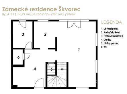 Nabízíme vám byt o dispozici 4+kk s podlahovou plochou 135 m², který se nachází v nově vznikajícím rezidenčním projektu Zámecké rezidence Škvorec. K bytu náleží zahrada o velikosti 268 m², garážové stání a venkovní parkovací místo. Byt je součástí domu o třech jednotkách a nabízí komfortní bydlení s atmosférou rodinného domu, s vlastním vstupem, soukromím a dostatkem venkovního prostoru. Dům je nízkoenergetický, navržený s ohledem na budoucnost. Je vybaven podlahovým vytápěním s možností regulace, vlastním tepelným čerpadlem a rekuperační jednotkou. Samozřejmostí jsou přípravy pro chytrou domácnost, kamerový a zabezpečovací systém, venkovní žaluzie a rolety, fotovoltaickou elektrárnu a dobíjecí stanici pro elektromobil. Prostor kuchyně je připraven tak, abyste si ji mohli navrhnout přesně podle svých představ. S realizací vám rádi pomůžeme. Dispozice 4+kk poskytuje dostatek prostoru pro rodinu i pohodlné zázemí pro práci z domova. Promyšlené uspořádání umožňuje oddělit obytnou a klidovou část, přičemž z hlavní obytné místnosti je přímý vstup na zahradu, která nabízí ideální místo pro relaxaci či posezení s rodinou a přáteli. Škvorec nabízí vynikající dopravní dostupnost do Prahy, vlakem jste na Masarykově nádraží přibližně za 35 minut. V obci najdete veškerou občanskou vybavenost, školku, školu, lékaře i menší obchody. Pro širší nabídku služeb lze využít nedaleké Úvaly nebo přímo Prahu. Okolí tvoří malebná příroda, ideální pro procházky, cyklistiku a volnočasové aktivity. S financováním vám rádi pomůžeme – nabízíme kompletní servis včetně vyřízení hypotečního úvěru. Pokud vás nabídka zaujala, neváhejte mě kontaktovat. Ráda Vás tímto bytem osobně provedu.