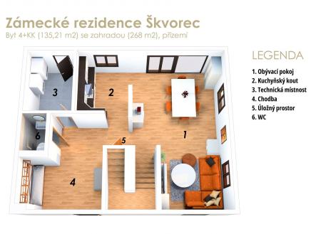 Nabízíme vám byt o dispozici 4+kk s podlahovou plochou 135 m², který se nachází v nově vznikajícím rezidenčním projektu Zámecké rezidence Škvorec. K bytu náleží zahrada o velikosti 346 m², garážové stání a venkovní parkovací místo. Byt je součástí domu o třech jednotkách a nabízí komfortní bydlení s atmosférou rodinného domu, s vlastním vstupem, soukromím a dostatkem venkovního prostoru. Dům je nízkoenergetický, navržený s ohledem na budoucnost. Je vybaven podlahovým vytápěním s možností regulace, vlastním tepelným čerpadlem a rekuperační jednotkou. Samozřejmostí jsou přípravy pro chytrou domácnost, kamerový a zabezpečovací systém, venkovní žaluzie a rolety, fotovoltaickou elektrárnu a dobíjecí stanici pro elektromobil. Prostor je ve stavu White Wall, tedy připraven tak, abyste si mohli bydlení navrhnout přesně podle svých představ. S realizací vám rádi pomůžeme. Dispozice 4+kk poskytuje dostatek prostoru pro rodinu i pohodlné zázemí pro práci z domova. Promyšlené uspořádání umožňuje oddělit obytnou a klidovou část, přičemž z hlavní obytné místnosti je přímý vstup na zahradu, která nabízí ideální místo pro relaxaci či posezení s rodinou a přáteli. Škvorec nabízí vynikající dopravní dostupnost do Prahy, vlakem jste na Masarykově nádraží přibližně za 35 minut. V obci najdete veškerou občanskou vybavenost, školku, školu, lékaře i menší obchody. Pro širší nabídku služeb lze využít nedaleké Úvaly nebo přímo Prahu. Okolí tvoří malebná příroda, ideální pro procházky, cyklistiku a volnočasové aktivity. S financováním vám rádi pomůžeme – nabízíme kompletní servis včetně vyřízení hypotečního úvěru. Pokud vás nabídka zaujala, neváhejte mě kontaktovat. Ráda Vás tímto bytem osobně provedu.