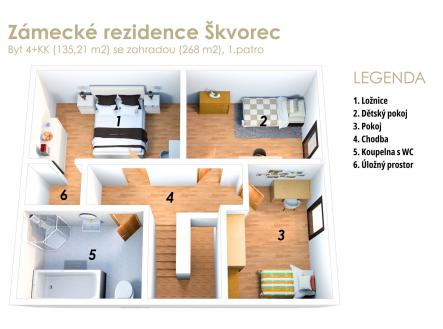 Nabízíme vám byt o dispozici 4+kk s podlahovou plochou 135 m², který se nachází v nově vznikajícím rezidenčním projektu Zámecké rezidence Škvorec. Tento byt je jednou z jednotek, které jsou v rámci projektu k dispozici, a projekt nabízí také další byty v různých dispozicích, ze kterých si můžete vybrat podle svých potřeb. K bytu náleží zahrada o velikosti 346 m², garážové stání a venkovní parkovací místo. Byt je součástí domu o třech jednotkách a nabízí komfortní bydlení s atmosférou rodinného domu, s vlastním vstupem, soukromím a dostatkem venkovního prostoru. Dům je nízkoenergetický, navržený s ohledem na budoucnost. Je vybaven podlahovým vytápěním s možností regulace, vlastním tepelným čerpadlem a rekuperační jednotkou. Samozřejmostí jsou přípravy pro chytrou domácnost, kamerový a zabezpečovací systém, venkovní žaluzie a rolety, fotovoltaickou elektrárnu a dobíjecí stanici pro elektromobil. Prostor je ve stavu White Wall, tedy připraven tak, abyste si mohli bydlení navrhnout přesně podle svých představ. S realizací vám rádi pomůžeme. Dispozice 4+kk poskytuje dostatek prostoru pro rodinu i pohodlné zázemí pro práci z domova. Promyšlené uspořádání umožňuje oddělit obytnou a klidovou část, přičemž z hlavní obytné místnosti je přímý vstup na zahradu, která nabízí ideální místo pro relaxaci či posezení s rodinou a přáteli. Škvorec nabízí vynikající dopravní dostupnost do Prahy, vlakem jste na Masarykově nádraží přibližně za 35 minut. V obci najdete veškerou občanskou vybavenost, školku, školu, lékaře i menší obchody. Pro širší nabídku služeb lze využít nedaleké Úvaly nebo přímo Prahu. Okolí tvoří malebná příroda, ideální pro procházky, cyklistiku a volnočasové aktivity. S financováním vám rádi pomůžeme – nabízíme kompletní servis včetně vyřízení hypotečního úvěru. Pokud vás nabídka zaujala, neváhejte mě kontaktovat. Ráda vás osobně provedu nejen tímto bytem, ale představím vám i další dostupné jednotky v projektu, abyste si mohli vybrat bydlení, které vám bude nejlépe vyhovovat.