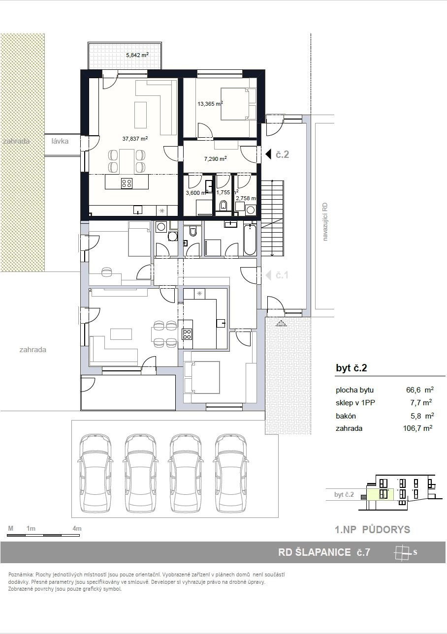 V rámci projektu Nové Šlapanice, který vyrůstá na začátku Šlapanic si Vám dovolujeme představit výjimečné a na danou lokalitu ojedinělé bydlení. Celý projekt je v nadstandartním provedení. Představujeme Vám 3.etapu, která je zaměřena na výstavbu viladomů. Každý viladům má 3 bytové jednotky a ateliér Je to ideální místo pro ty, kteří hledají kvalitní, moderní, prostorné a dispozičně chytře řešené bydlení. V tomto projektu nabízíme k prodeji byt 2+KK se zahradou a terasou. Součástí prodeje bytu je kuchyňská linka, dělaná na míru. K bytu náleží i sklep a 1 parkovací stání, které je součástí kupní ceny. V celém bytě jsou venkovní žaluzie. Možnost dokoupení dalšího parkovacího stání za 200.000,-Kč Viladům 7 na ulici Stanislava Hanzelky Byt č.2 je umístěn v 1.NP Dispozice: chodba 7,29m2, obývací pokoj s kuchyňským koutem 37,83m2 s přímým vstupem přes lávku na zahradu 106,7m2 a s balkonem 5,8m2, ložnice 13,36m2, koupelna se sprchovým koutem 3,6m2 a WC zvlášť 1,75m2 a technická místnost 2,75m2. Standarty bytu, které jsou součástí kupní ceny: - podlahy vinyl, keramická dlažba - sanitární technika, sprchový kout, včetně sprchového setu, umyvadlo včetně baterie, vana, závěsné WC, zrcadlo, obklady -mramor - interiérové dveře + obložkové zárubně, vstupní dveře - podlahové vytápění, topné těleso - příprava na klimatizaci Samotná lokalita nabízí širokou škálu pracovních možností a veškerou potřebnou občanskou vybavenost a výbornou dojezdnost díky dálnici D1 a D2. Také zde v docházkové vzdálenosti nalezneme školu, školku, řadu obchodů, restaurací a služeb, trolejbusovou zastávku, ale především vlakové nádraží, z kterého jste na Hlavním vlakovém nádraží v Brně za 15 min. Dokončení bytů je plánované na 3Q roku 2026. Výhodou je model financování nemovitosti. Pokud by Vás nabídka tohoto či jakéhokoliv jiného bytu v tomto projektu zaujala, kontaktujte prosím makléře, u kterého se dozvíte více. Děláme moderní bydlení dostupnější. Více o projektu na našich webových stránkách www.viladomy-slapanice.cz
