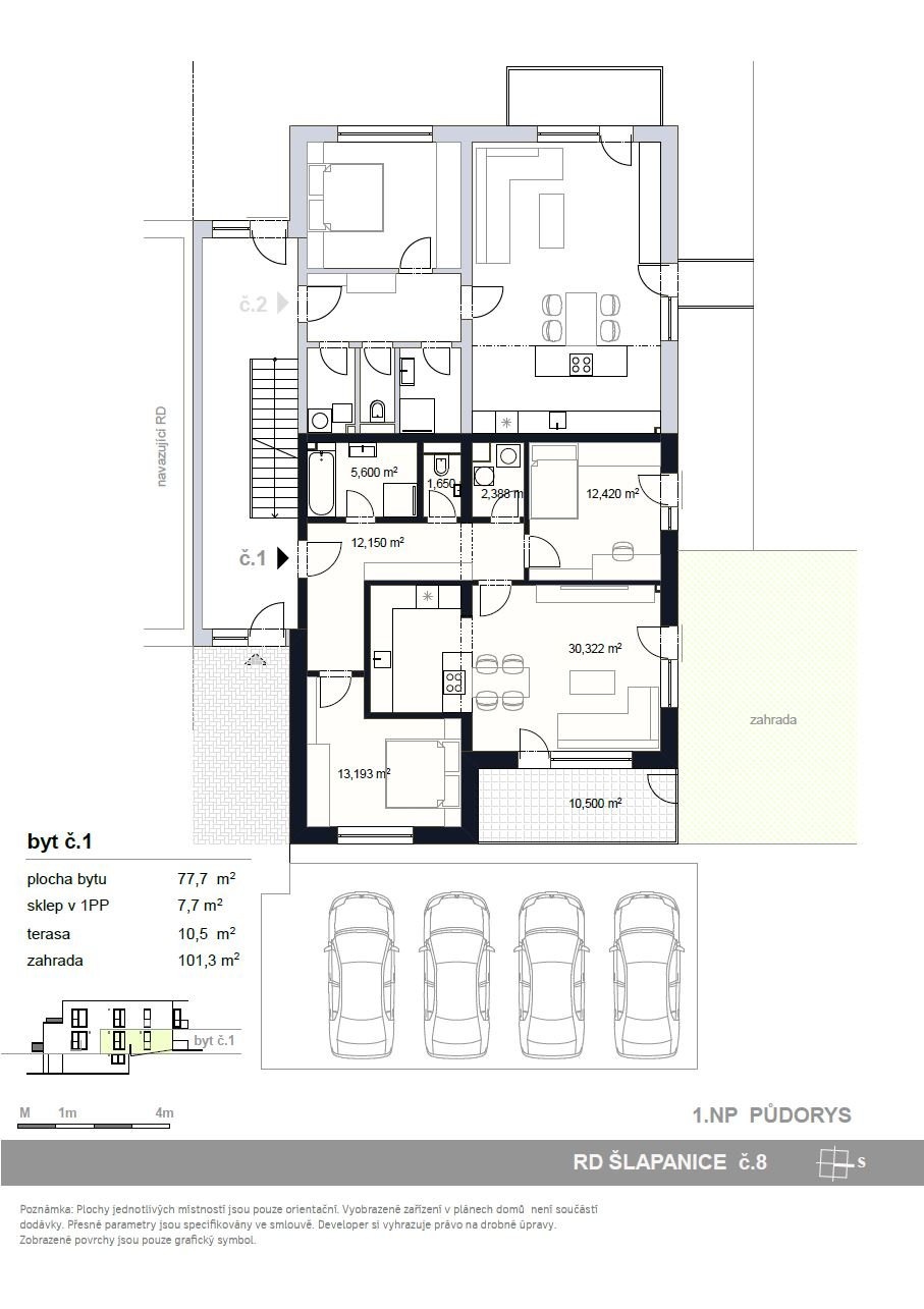 V rámci projektu Nové Šlapanice, který vyrůstá na začátku Šlapanic si Vám dovolujeme představit výjimečné a na danou lokalitu ojedinělé bydlení. Celý projekt je v nadstandartním provedení. Představujeme Vám 3.etapu, která je zaměřena na výstavbu viladomů. V každém viladomě jsou 3 bytové jednotky a ateliér. Je to ideální místo pro ty, kteří hledají kvalitní, moderní, prostorné a dispozičně chytře řešené bydlení. Nabízíme k prodeji byt 3+KK se zahradou, terasou, sklepem a 1 parkovacím stáním. Možnost dokoupí další parkovací stání za cenu 200.000,-Kč Součástí prodeje bytu je kuchyňská linka, dělaná na míru. K bytu náleží i sklep, který je součástí kupní ceny. V celém bytě jsou venkovní žaluzie. Viladum č.8 na ulici Stanislava Hanzelky Byt č.1 je umístěn v 1.NP Dispozice: chodba 12,15m2, obývací pokoj s kuchyňským koutem 30,3m2 s přímým vstupem na terasu 10,5m2 a zahradu 101,3m2, ložnice 13,19m2, dětský pokoj 12,42m2, koupelna s vanou a sprchovým koutem 5,6m2, WC zvlášť 1,65m2. a technickou místností 2,38m2. Standarty bytu, které jsou součástí kupní ceny: - podlahy vinyl, keramická dlažba - sanitární technika, sprchový kout, včetně sprchového setu, umyvadlo včetně baterie, vana, závěsné WC, zrcadlo, obklady - mramor - interiérové dveře + obložkové zárubně, vstupní dveře - podlahové vytápění, topné těleso - příprava na klimatizaci Samotná lokalita nabízí širokou škálu pracovních možností a veškerou potřebnou občanskou vybavenost a výbornou dojezdnost díky dálnici D1 a D2. Také zde v docházkové vzdálenosti nalezneme školu, školku, řadu obchodů, restaurací a služeb, trolejbusovou zastávku, ale především vlakové nádraží, z kterého jste na Hlavním vlakovém nádraží v Brně za 15 min. Dokončení bytů je plánované na 3Q roku 2026. Výhodou je model financování nemovitosti. Pokud by Vás nabídka tohoto či jakéhokoliv jiného bytu v tomto projektu zaujala, kontaktujte prosím makléře, u kterého se dozvíte více. Děláme moderní bydlení dostupnější. Více o projektu na našich webových stránkách www.viladomy-slapanice.cz