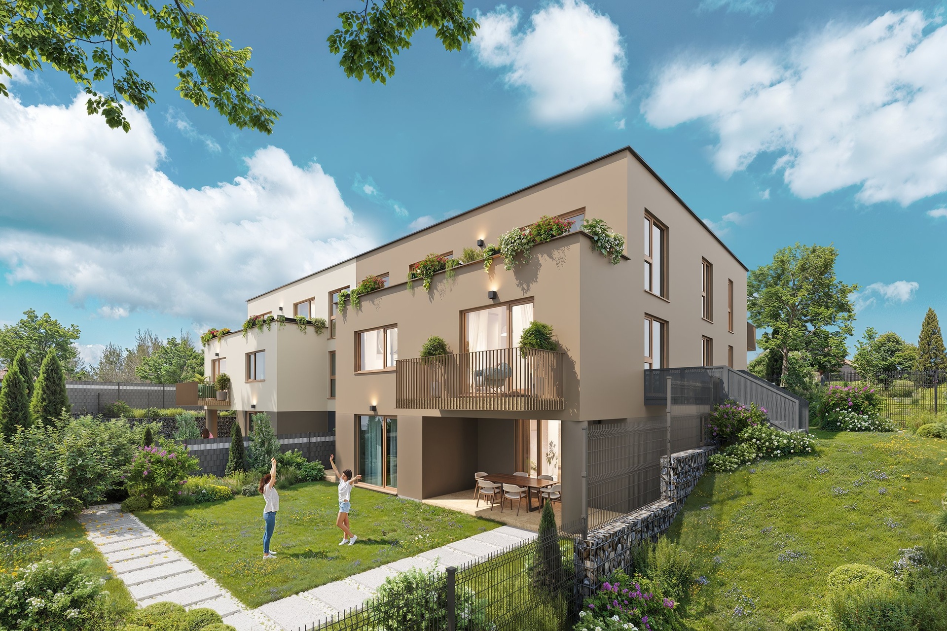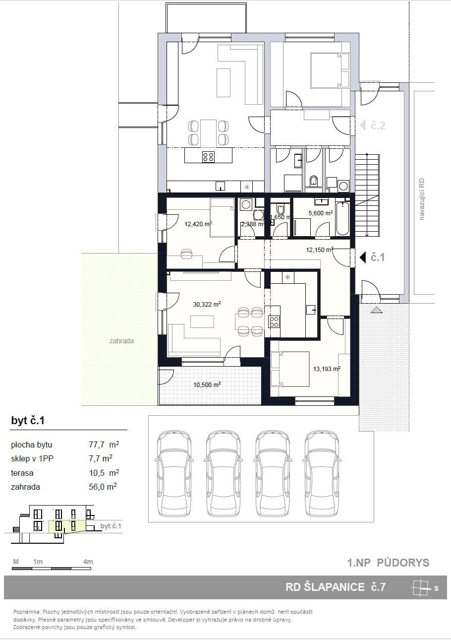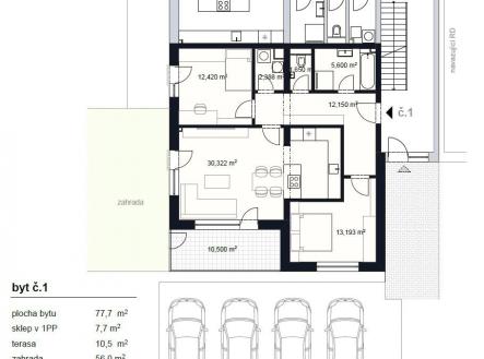 V rámci projektu Nové Šlapanice, který vyrůstá na začátku Šlapanic si Vám dovolujeme představit výjimečné a na danou lokalitu ojedinělé bydlení. Celý projekt je v nadstandartním provedení. Představujeme Vám 3.etapu, která je zaměřena na výstavbu viladomů. V každém viladomě jsou 3 bytové jednotky a ateliér. Je to ideální místo pro ty, kteří hledají kvalitní, moderní, prostorné a dispozičně chytře řešené bydlení. Nabízíme k prodeji byt 3+KK s terasou 10,5m2, zahradou 56m2, sklepem 7,7m2 a 1 parkovacím stáním, vše je součástí kupní ceny. Možnost dokoupení dalšího parkovacího stání za 300.000,-Kč První tři kupující v tomto projektu mají BONUS - KUCHYŃSKOU LINKU VČETNĚ VŠECH SPOTŘEBIČŮ Zn. ELECTROLUX V HODNOTĚ 650.000,-Kč ZDARMA. V celém bytě jsou venkovní žaluzie. Viladum č.7 na ulici Stanislava Hanzla Byt č.1 je umístěn v 1.NP Dispozice: chodba 12,42m2, obývací pokoj s kuchyňským koutem 30,3m2 s přímým vstupem na terasu 10,5m2 a zahradu 56m2, ložnice 13,19m2, dětský pokoj 12,42m2, koupelna s vanou a sprchovým koutem 5,6m2, WC zvlášť 1,65m2. a technickou místností 2,38m2. Standarty bytu, které jsou součástí kupní ceny: - podlahy vinyl, keramická dlažba - sanitární technika, sprchový kout, včetně sprchového setu, umyvadlo včetně baterie, vana, závěsné WC, zrcadlo, obklady - mramor - interiérové dveře + obložkové zárubně, vstupní dveře - podlahové vytápění, topné těleso - klimatizace - venkovní osvětlení - rekuperace Samotná lokalita nabízí širokou škálu pracovních možností a veškerou potřebnou občanskou vybavenost a výbornou dojezdnost díky dálnici D1 a D2. Také zde v docházkové vzdálenosti nalezneme školu, školku, řadu obchodů, restaurací a služeb, trolejbusovou zastávku, ale především vlakové nádraží, z kterého jste na Hlavním vlakovém nádraží v Brně za 15 min. Dokončení bytů je plánované na 3Q roku 2026. Výhodou je model financování nemovitosti. Pokud by Vás nabídka tohoto či jakéhokoliv jiného bytu v tomto projektu zaujala, kontaktujte prosím makléře, u kterého se dozvíte více. Děláme moderní bydlení dostupnější.