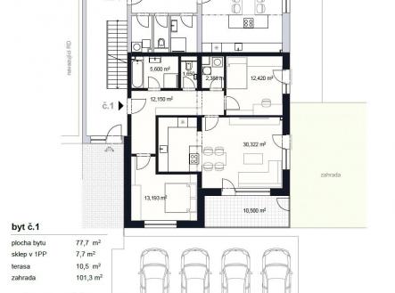 V rámci projektu Nové Šlapanice, který vyrůstá na začátku Šlapanic si Vám dovolujeme představit výjimečné a na danou lokalitu ojedinělé bydlení. Celý projekt je v nadstandartním provedení. Představujeme Vám 3.etapu, která je zaměřena na výstavbu viladomů. V každém viladomě jsou 3 bytové jednotky a ateliér. Je to ideální místo pro ty, kteří hledají kvalitní, moderní, prostorné a dispozičně chytře řešené bydlení. Nabízíme k prodeji byt 3+KK s terasou 10,5m2, zahradou 101,3m2, sklepem 7,7m2 a 1 parkovacím stáním. Vše je součástí kupní ceny. Možnost dokoupit další parkovací stání za cenu 300.000,-Kč. První tři kupující v tomto projektu mají BONUS - KUCHYŃSKOU LINKU VČETNĚ VŠECH SPOTŘEBIČŮ Zn. ELECTROLUX V HODNOTĚ 650.000,-Kč ZDARMA. V celém bytě jsou venkovní žaluzie. Viladum č.8 na ulici Stanislava Hanzla Byt č.1 je umístěn v 1.NP Dispozice: chodba 12,15m2, obývací pokoj s kuchyňským koutem 30,3m2 s přímým vstupem na terasu 10,5m2 a zahradu 101,3m2, ložnice 13,19m2, dětský pokoj 12,42m2, koupelna s vanou a sprchovým koutem 5,6m2, WC zvlášť 1,65m2. a technickou místností 2,38m2. Standarty bytu, které jsou součástí kupní ceny: - podlahy vinyl, keramická dlažba - sanitární technika, sprchový kout, včetně sprchového setu, umyvadlo včetně baterie, vana, závěsné WC, zrcadlo, obklady - mramor - interiérové dveře + obložkové zárubně, vstupní dveře - podlahové vytápění, topné těleso - klimatizace - rekuperace Samotná lokalita nabízí širokou škálu pracovních možností a veškerou potřebnou občanskou vybavenost a výbornou dojezdnost díky dálnici D1 a D2. Také zde v docházkové vzdálenosti nalezneme školu, školku, řadu obchodů, restaurací a služeb, trolejbusovou zastávku, ale především vlakové nádraží, z kterého jste na Hlavním vlakovém nádraží v Brně za 15 min. Dokončení bytů je plánované na 3Q roku 2026. Výhodou je model financování nemovitosti. Pokud by Vás nabídka tohoto či jakéhokoliv jiného bytu v tomto projektu zaujala, kontaktujte prosím makléře, u kterého se dozvíte více. Děláme moderní bydlení dostupnější.