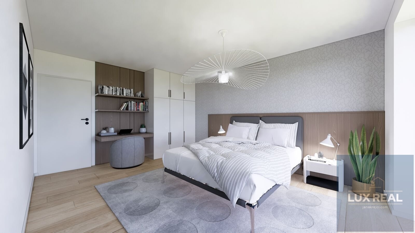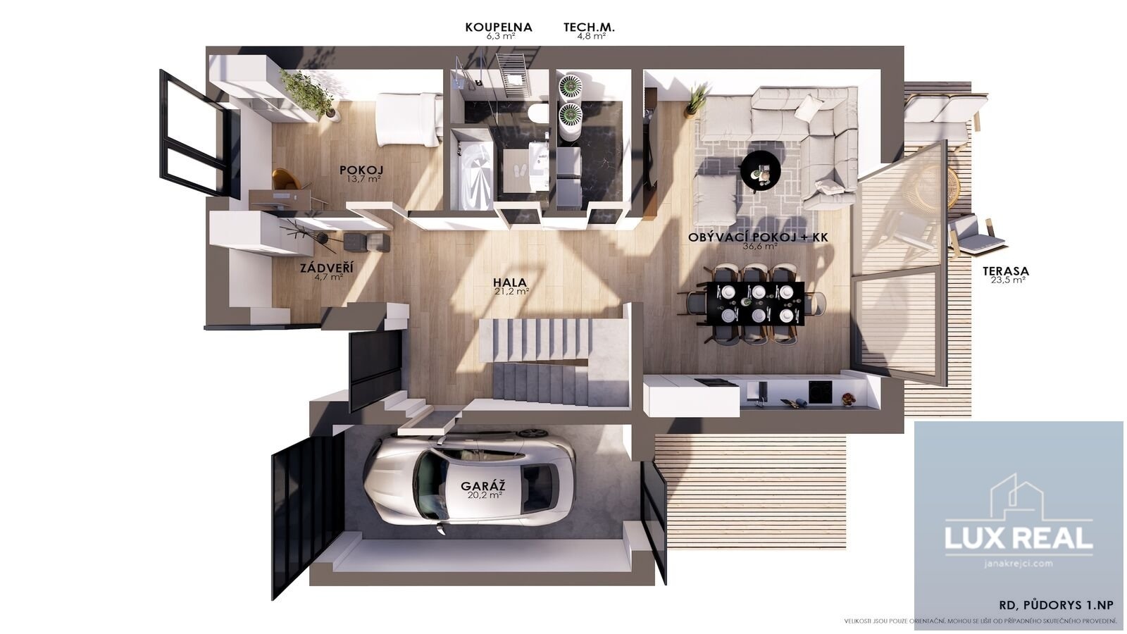 V rámci projektu Nové Šlapanice, který vyrůstá na začátku Šlapanic si Vám dovolujeme představit výjimečné a na danou lokalitu ojedinělé bydlení. Tento typ domu představuje ideální místo pro ty, kdo hledá kvalitní, moderní, prostorné a dispozičně chytře řešené bydlení. Jedná se o 4. Etapu v tomto projektu, která nabízí prodej řadových rodinných domů s terasami, zahradou, garáží a parkovacím stáním. Rodinný dům 5+KK o výměře 176,2 m2, terasou 26,8m2, zahradou 338m2, garáží 20,2 m2 a 2 parkovacími stáními má velkorysé dispoziční řešení. 1.NP - zádveří, hala, pokoj, koupelna včetně WC, technická místnost, obývací pokoj s kuchyňským koutem a vstupem přes terasu na zahradu, garáž. 2.NP - pokoj, ložnice, dětský pokoj, koupelna, WC a přes terasu opět vstup na zahradu. Standarty domu, které jsou součástí kupní ceny: - podlahy vinyl, keramická dlažba - sanitární technika, sprchový kout, včetně sprchového setu, umyvadlo včetně baterie, vana, závěsné WC, zrcadlo. - interiérové dveře + obložkové zárubně, vstupní dveře - podlahové vytápění, topné těleso Samotná lokalita nabízí širokou škálu pracovních možností a veškerou potřebnou občanskou vybavenost a výbornou dojezdnost díky dálnici D1 a D2. Také zde v docházkové vzdálenosti nalezneme školu, školku, řadu obchodů, restaurací a služeb, trolejbusovou zastávku, ale především vlakové nádraží, z kterého jste na Hlavním vlakovém nádraží v Brně va 15 min. Dokončení bytů je plánované na konec roku 2026. Výhodou je model financování nemovitosti. Pokud by Vás nabídka tohoto či jakéhokoliv jiného bytu v tomto projektu zaujala, kontaktujte prosím makléře, u kterého se dozvíte více. Kupní cena nezahrnuje provizi RK. Děláme moderní bydlení dostupnější.