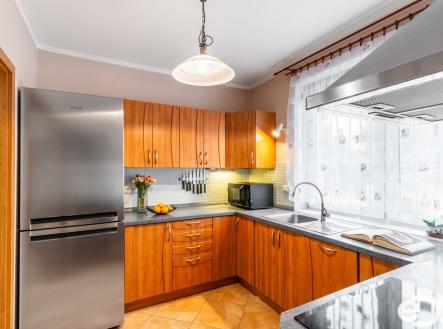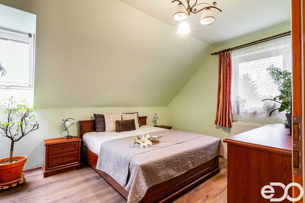 Dům o dispozici 5+kk postavila stavební firma pro vlastní bydlení, takže kvalitní materiály i provedení jsou znát na každém detailu. Obytná plocha 120 m² je ideálně řešená pro rodinu. Technické vybavení a sítě: • napojení na vodovod, kanalizaci a elektřinu • vlastní studna • plynový kotel + bojler na teplou vodu • krbová kamna • klimatizace • bezpečnostní kamerový systém se vzdálenou správou • čidla oken a pohybová čidla Dům je technicky velmi dobře vybavený – kromě kompletních sítí nabízí i vlastní studnu, moderní zabezpečení s online dohledem a klimatizaci pro celoroční komfort. Atmosféru domova doplňují krbová kamna. Pozemek má obdélníkový tvar a lze jej případně rozdělit na dva, což vytváří zajímavý investiční potenciál. Součástí zázemí je samostatná garáž s elektrickými vraty a další parkovací místa na zpevněné ploše přímo před domem. Přízemí: • prostorný obývací pokoj se vstupem na terasu • terasa se saunou a kamenným grilem • kuchyňský kout se špajzem • ložnice/pracovna • koupelna • technická místnost • krbová kamna Patro: • ložnice • dva samostatné pokoje • šatna • koupelna • vstup na půdu Sluhy jsou klidná obec s perfektní dostupností do Prahy – do Letňan se autem dostanete za zhruba 10 minut, MHD navazuje na metro C. V místě funguje kompletní občanská vybavenost (ZŠ, MŠ). Příroda začíná doslova za domem a okolí nabízí krásné cyklostezky, lesy a výlety směrem na Líbeznice, Mělník nebo Kokořínsko. Dům nabízí perfektní kombinaci klidné lokality u Prahy, kvalitního provedení, moderních technologií a velkého pozemku s možností dalšího využití.