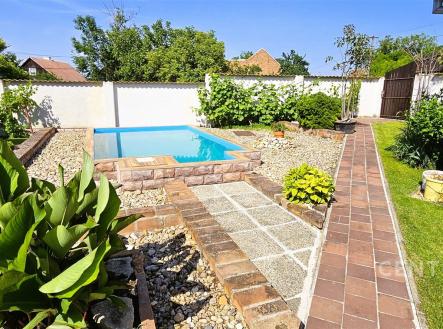 Nabízíme velice příjemné bydlení v rodinném domě, v klidné obytné zástavbě obce Slup. Celková plocha je 915 m2, zastavěná plocha 154 m2 a zahrada 761 m2. Dispozičně je dům řešen jako 5+1 s letní kuchyní a zimní zahradou a je zasazen do krásné okrasné zahrady s bazénem. Na zahradě je umístěna samostatná stavba – vinný sklep s posezením a krbem a vstupem do sklepní části na uchování vína. Z boční strany je pak venkovní posezení kryté pergolou a s krbem. Parkování je možné ve dvou garážích a také pod dvěma pergolami. Stáří domu cca 30 let, průběžně udržovaný. Dvě koupelny. Dům je vytápěn elektrickým kotlem, kamny na tuhá paliva a krbem v obývacím pokoji. Nemovitost je napojena na inženýrské sítě – elektřinu, vodu a kanalizaci. Přípojka plynu před domem. Zahrada přístupná i ze zadní strany brankou. Obec Slup se nachází asi 15 km jihovýchodně od Znojma a blízko rakouských hranic.