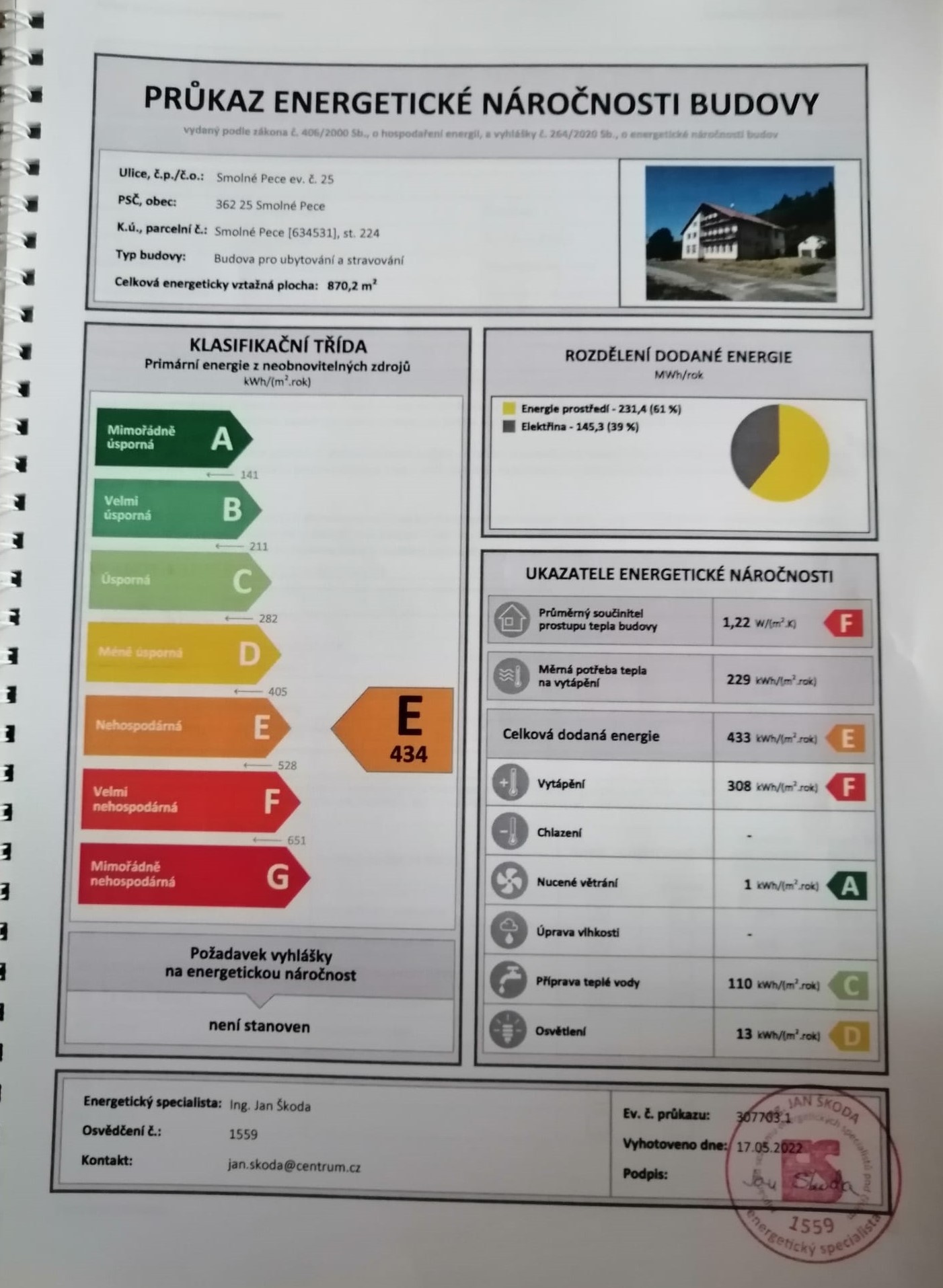 Exkluzivně nabízíme k prodeji nemovitost s přiléhajícími pozemky v malebné obci Smolné pece, v okrese Karlovy Vary. Třípodlažní cihlová budova o užitné ploše 1.015 m2 se momentálně využívá pro provoz rodinného penzionu. Svým budoucím majitelům nabízí 15 ubytovacích pokojů, plně vybavenou kuchyni, venkovní zahrádku s posezením, garáž a pozemky o celkové výměře 5.533 m2. Dům je zkoulaudovaný jako stavba občanské vybavenosti. V přízemí budovy se nachází restaurace s barem a kuchyní - jedná se o tři místnosti, vybavenou kuchyň s přípravnou jídel, skladové a technické místnosti. V přízemí domu je dále k dispozici recepce, zázemí a toalety. Venkovní zahrádka/terasa s krásným výhledem na okolní přírodu a vlastní pozemky. Druhé a třetí podlaží domu nabízí dohromady 15 vybavených pokojů o rozloze cca 15 – 25 m2. Každý pokoj má k dispozici vlastní koupelnu s toaletou a sprchovým koutem a šest z nich má navíc vlastní balkon s krásným výhledem na okolní krajinu. Na každém patře se dále nachází několik úklidových místností. Přilehlé pozemky do budoucna nabízí zbudování okrasné zahrady, dětského hřiště, či dalších parkovacích míst. Dále je zde k dispozici dvoupatrová, zděná garáž pro 2 vozidla a skladovací prostor ve druhém podlaží. Přístupová komunikace k domu je obecní. Budova je vytápěna tepelnými čerpadly, které zároveň slouží i k ohřevu vody, která je zajištěna ze dvou studen na vlastních pozemcích. Odpad je momentálně řešen bioseptikem se stavebním povolení na ČOV. Střešní sedlová krytina stará max 20 let, krovy v dobrém stavu. V roce 2008 zde probíhala nákladná rekonstrukce interiéru (plastová okna, podlahy, obložení a výbava koupelen, el. rozvody a vytápění). V roce 2021 proběhla instalace nových tepelných čerpadel na vytápění a ohřev vody, spolu s novou fasádou na jedné polovině domu. Měsíční náklady na provoz domu cca 19.000,-/měs. (elektřina a vytápění). Nejbližší občanská vybavenost a doprava je k dispozici v přilehlých obcích, jako je Nejdek (5 km), nebo Karlovy Vary (11 km). Lokalita nabízí bezpočet turistických atrakcí a možností na trávení volnočasových aktivit. Na své si přijdou i lyžaři, či běžkaři - ski areály Pernink, Merklín, či Nové Hamry jsou vzdálené cca 8 km od Smolných Pecí. Tato nemovitost je ideální pro kombinaci vlastního bydlení a podnikání, nebo bydlení pro vícegenerační rodiny. Pro bližší informace se na nás neváhejte obrátit, vřele doporučujeme prohlídku nemovitosti,. Pro komunikaci uvádějte evidenční číslo zakázky N113123.