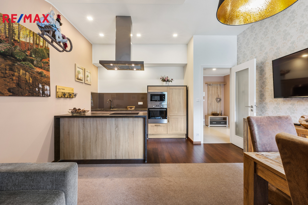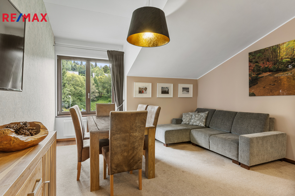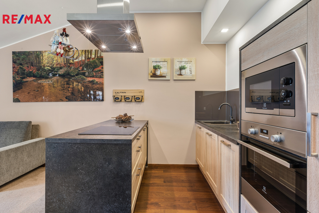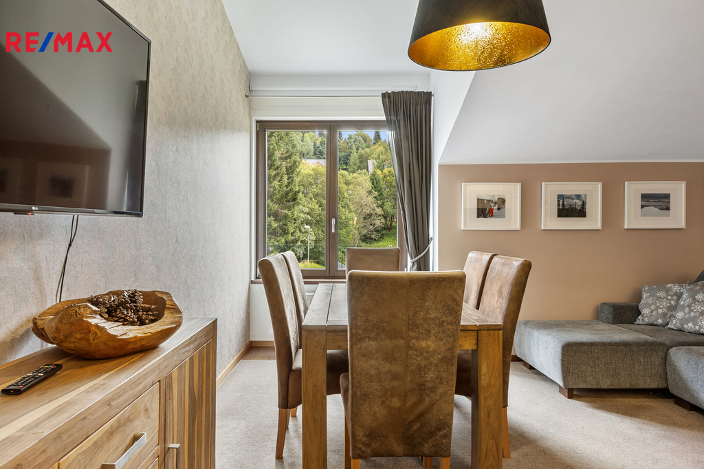 Dovoluji si Vám nabídnout ke koupi prostorný a plně vybavený apartmán 2+kk o podlahové ploše téměř 60 m², který se nachází v klidné části Špindlerova Mlýna, v docházkové vzdálenosti od centra města. Apartmán se nachází v luxusním horském apartmánovém komplexu Luční dům, který byl kolaudovaný v 10/2015. Dispozičně nabízí prostorný obývací pokoj s plně vybavenou kuchyňskou linkou vč. myčky, barovým pultem, jídelním stolem se židlemi a rozkládací pohovkou, dále ložnici se dvěma manželskými postelemi, samostatnou šatnu s vestavěnými skříněmi a přípojkou na pračku a sušičku, a koupelnu s vanou a toaletou. V bytě jsou vysoké stropy, které zajišťují vzdušnost a světlost celého prostoru. Vstupní dveře jsou bezpečnostní, okna dřevěná. Interiér doplňují polopropustné bílé rolety a závěsy, které poskytují soukromí i estetický dojem. Vytápění je zajištěno pomocí centrálního systému Maibes, který umožňuje pohodlné ovládání na dálku dle aktuálních potřeb uživatele. K bytu náleží sklepní kóje o výměře 4,5 m², vybavená sušící skříní na oblečení a obuv a elektrickou přípojkou pro nabíjení elektrokol. Kromě garážového stání v suterénu domu je k dispozici také druhé parkovací místo přímo před budovou, které je přístupné na základě parkovací karty. Vjezd do garáží je na dálkové ovládání, vrata se zavírají automaticky. Provozní náklady jsou velmi příznivé: měsíční poplatek do fondu SVJ činí cca 3 000 Kč, zálohy na elektřinu 450 Kč. Apartmán je nabízen včetně veškerého vybavení a zařízení, je ve výborném technickém stavu a připraven k okamžitému užívání bez nutnosti dalších investic. Díky své poloze, technickému standardu, doplňkovému zázemí a velmi praktickému uspořádání se jedná o výjimečnou nabídku v rámci lokality Špindlerův Mlýn. Tato nemovitost představuje ideální příležitost pro rekreační využití, trvalé bydlení či jako výhodná investice s potenciálem pro krátkodobé pronájmy. Doporučuji osobní prohlídku.