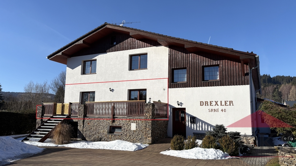 Exkluzivně vám nabízíme na prodej krásný, slunný, prostorný, částečně zařízený apartmán 3+kk (93,3 m2) s velkou terasou (26,75 m2), vlastním wellnessem (14,55 m2 masážní vířivka whirpool, sprcha a WC), skladem (11,05 m2) v suterénu rekreačního domu (5 apartmánů) a parkovacím místem na oploceném pozemku. Tento prostorný apartmán se nachází v 1.NP, situovaný v centru v původní části horského šumavského městečka Srní (852 m.n.m.), jenž je výchozím bodem a turistickým centrem v této části NP Šumava. Popis: společná chodba se schodištěm; byt 3+kk (93,3 m2): vstupní hala (šatní skříně, zrcadlo, kazetové dveře), hlavní koupelna 6,55 m2 (vana, sprchový kout, umyv. se zrcadlem, WC, topný žebřík, komoda), prostorný obývací pokoj 37,55 m2 s krbem, kuch. koutem (moderní rohová kuch. linka s vestavěnými spotřebiči: HV trouba, MV trouba, sklo-ker. deska, digestoř, myčka, lednice s mrazákem, RV konvice), jídelnou a dvěma francouzskými okny spojující velkou vyvýšenou terasu 26,75 m2 s posezením a brankou k parkovišti, hlavní ložnice 17,1 m2 (manž. postel, 2x noční stolek s lampičkou, komody, šatní skříň), ložnice 14,7 m2 s bezbarierovou koupelnou 3,5 m2 (bezb. sprcha, umyv., WC, topný žebřík). Prodej vč. bytového vybavení! K bytu náleží vlastní suterénní wellness - vířivka Whirpoool, se sprchou a koupelnou (WC a umyv.), skladem a možnost užívání spol. pergoly s venk. krbem s grilem a posezením. Celková plocha vč. terasy, wellnessu a skladu: 147,1 m2; Podlahová plocha bytu: 93,3 m2; Provozní náklady měs.: služby 6.500 Kč (topení, elektřina, vodné/stočné, fond oprav, svoz odpadu, správcovství, el. a úklid spol. prostor). Vytápění a ohřev TUV: ÚT – společné tepelné čerpadlo a kotel na L.T.O.; lokálně – krb a el. odporové podlahové topení v části bytu, kde je dlažba. Unikátní příležitost koupě velkého apartmánu s vlastním wellnessem, prostornou terasou a parkováním v této velmi žádané, oblíbené lokalitě v srdci NP Šumava za rozumnou cenu 95.698 Kč/m2. Obec Srní: obchod COOP, obecní úřad s poštou, cukrárna, restaurace, benzínka, hotel s krytým bazénem a sportovní halou (tenis v zimě), BUS do Sušice i Prahy; výchozí trasy pro pěší a cyklo-turistiku… Praha 156 km, Sušice 22 km. Železná Ruda 29 km.