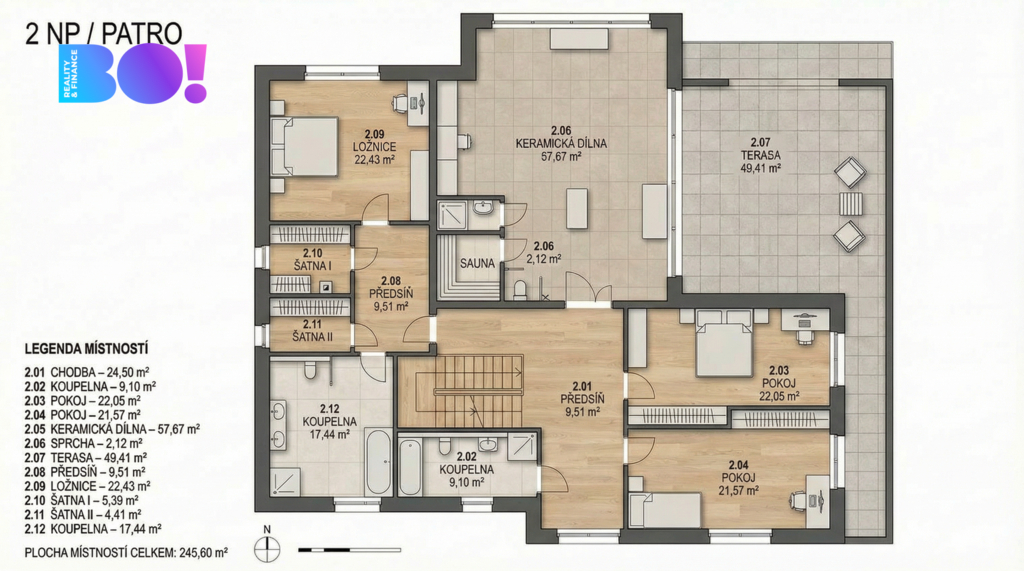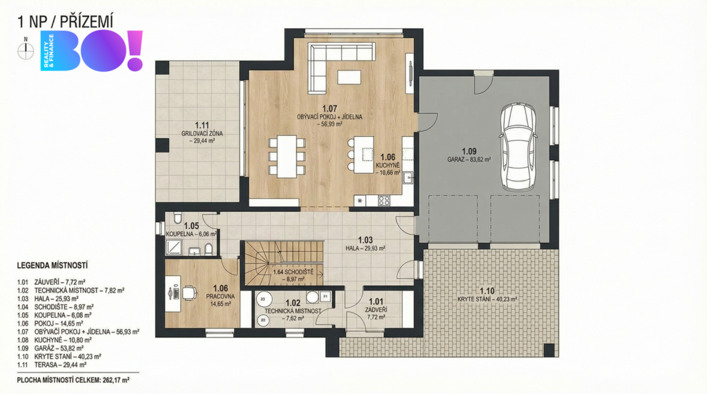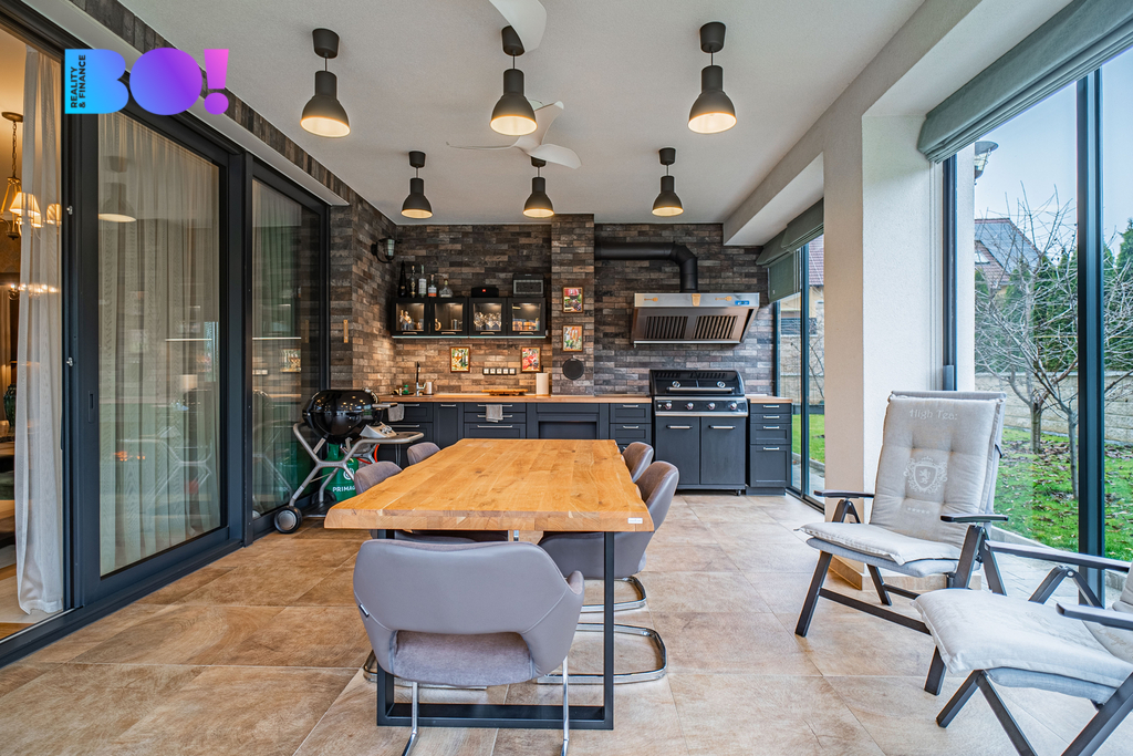 Nabízíme k prodeji samostatně stojící rodinný dům o dispozici 6+kk ve Staré Huti u Dobříše. Dům je rozložen do tří podlaží (suterén, přízemí, patro) a nabízí nadstandardní užitnou plochu 543 m². Stojí na pozemku o celkové výměře 1009 m² (stavební parcela 329 m² + navazující pozemek 680 m²), takže kromě velkorysého interiéru získáte i plnohodnotné zázemí venku. Velkou výhodou je kombinace komfortu a úsporného provozu. Vytápění zajišťuje prémiové tepelné čerpadlo, dům má podlahové vytápění ve dvoustupňovém systému pro maximální pohodlí a flexibilitu, a zároveň fotovoltaickou elektrárnu, která výrazně snižuje náklady na provoz. Energetická náročnost je ve třídě PENB B. Samozřejmostí je také chytrá nabíječka pro elektromobil – praktické řešení, které dává smysl dnes i do budoucna. Interiér je postavený na kvalitních materiálech a nadčasovém provedení. Najdete zde masivní dubové schodiště, štukové omítky a praktickou kombinaci laminátových a keramických podlah. Kuchyňská linka značky Noblessa zapadá do konceptu domu, který je navržený pro každodenní rodinný provoz bez kompromisů. O světlo, soukromí i tepelný komfort se starají moderní hliníková okna s exkluzivními venkovními roletami v přízemí a elegantními žaluziemi v patře, včetně možnosti automatizace. Dům nabízí i příjemné zázemí pro relaxaci a volný čas – k dispozici je sauna a hobby prostor. Na zahradě oceníte letní kuchyni s grilem, ideální pro rodinné akce a setkávání s přáteli, a vzrostlou, pečlivě udržovanou zeleň s automatickým zavlažováním, která minimalizuje nároky na údržbu.