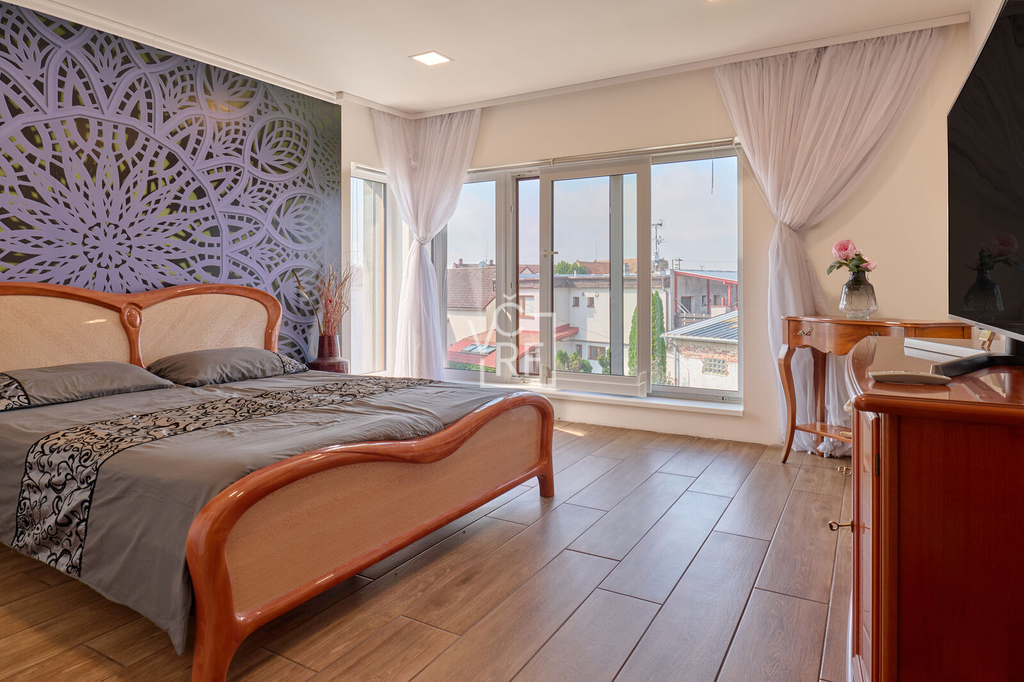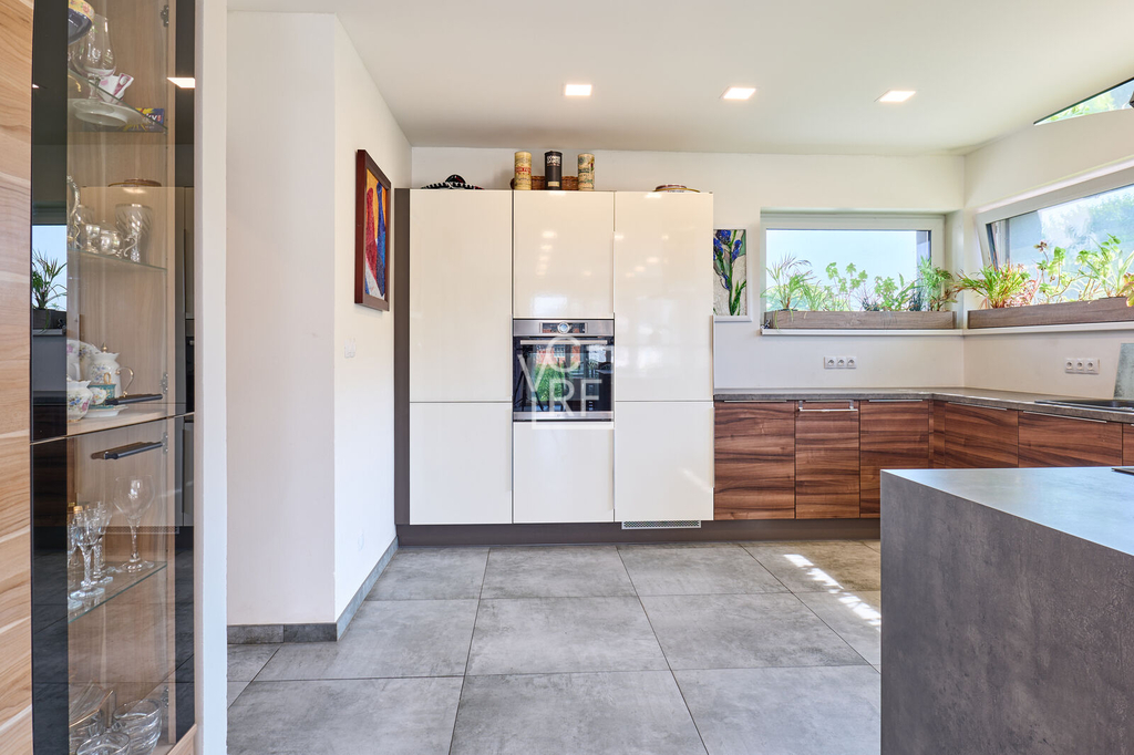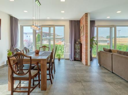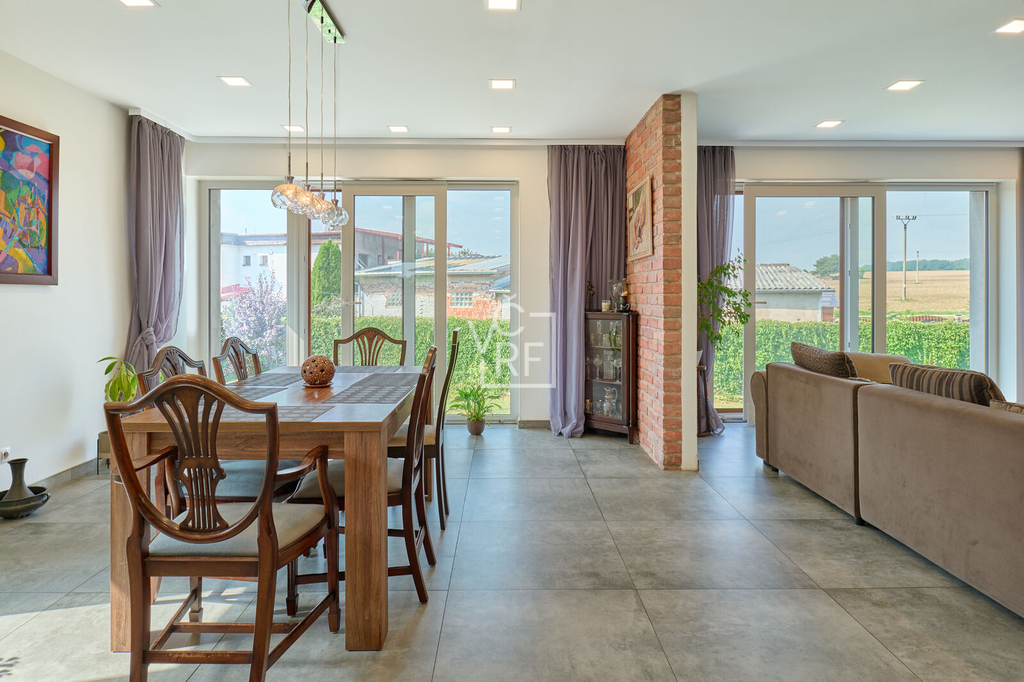 Prodej moderního rodinného domu s dispozicí 5+kk a užitnou plochou 214 m² na prostorném pozemku o velikosti 1428 m². Dům je dvoupatrový, podsklepený (využívá základy původní stavby). 1. NP: vstupní hala, technická místnost, koupelna s WC, kuchyně a jídelna, obývací pokoj, samostatný pokoj, schodiště do druhého patra a schodiště do sklepa. 2. NP: ložnice s vlastní šatnou, koupelnou a WC, dvě samostatné ložnice, koupelna s WC, technická místnost. Nemovitost je vybavena moderními technologiemi a systémy. V celém domě je instalováno podlahové vytápění. Dům je připraven pro chytrou domácnost díky nainstalovanému systému Loxon, který stačí pouze připojit. Pro energetickou soběstačnost slouží fotovoltaická elektrárna s výkonem 5 kW (16 panelů) a 4 bateriemi, což významně snižuje provozní náklady. Ohřev teplé vody zajišťuje elektrický bojler. Nemovitost dále disponuje bránou na dálkové ovládání a venkovními žaluziemi ve druhém patře. Dům má připojení na obecní vodovod, současně jsou k dispozici dvě vlastní studny. Odpad je aktuálně řešen septikem s možností připojení na obecní kanalizaci, která je v řešení. K dispozici je také nádrž na dešťovou vodu, kterou lze využít pro zavlažování zahrady nebo jiné účely. Součástí prodeje je kompletní vybavení domu, včetně moderní kuchyňské linky s vestavěnými spotřebiči. Na nemovitosti je v současné chvíli rozestavěna terasa, která není dokončena. Nový majitel má tedy jedinečnou příležitost uzpůsobit si konečný vzhled podle sebe. Jako neodmyslitelný bonus je krásná cihlová dvoupatrová stodola se zastavěnou plochou 100 m². Výhodou této nabídky je možnost převzetí hypotečních úvěrů s velmi výhodnými úrokovými sazbami – jeden s úrokem 1,99 % do roku 2028 a druhý s úrokem 2,12 % do roku 2029.