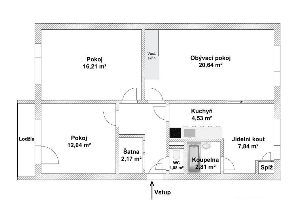 Hledáte stylové a praktické bydlení bez nutnosti dalších investic? Tento byt o dispozici 3+1 a podlahové ploše 77 m² vás zaujme nejen rekonstrukcí, ale i promyšleným dispozičním řešením a skvělou polohou v přízemí. Dispozice: • Vstupní chodba s úložnými prostory (2,7 m²), které zvenku působí jako vestavěná skříň – ideální pro kabáty, boty i domácí potřeby • Dva neprůchozí pokoje – vhodné jako ložnice, dětský pokoj nebo pracovna • Obývací pokoj se vstupem jak z kuchyně, tak z chodby – možnost propojit i oddělit podle nálady • Samostatná kuchyně s nadstandardní kuchyňskou linkou na míru • Koupelna s vanou • Samostatné WC • Balkon – ideální pro ranní kávu nebo posezení na čerstvém vzduchu Venkovní žaluzie zajišťují soukromí, tlumí hluk i prach z okolí. Byt má zděné jádro a je po kompletní rekonstrukci, stačí se jen nastěhovat. Přízemní umístění potěší jak rodiny s dětmi, tak seniory. Byt se nachází v klidné části Strážnice s výbornou dostupností a plnou občanskou vybaveností v docházkové vzdálenosti. Zaujala vás tato nabídka? Zavolejte a domluvte si prohlídku – tento byt vás přesvědčí naživo ještě víc!