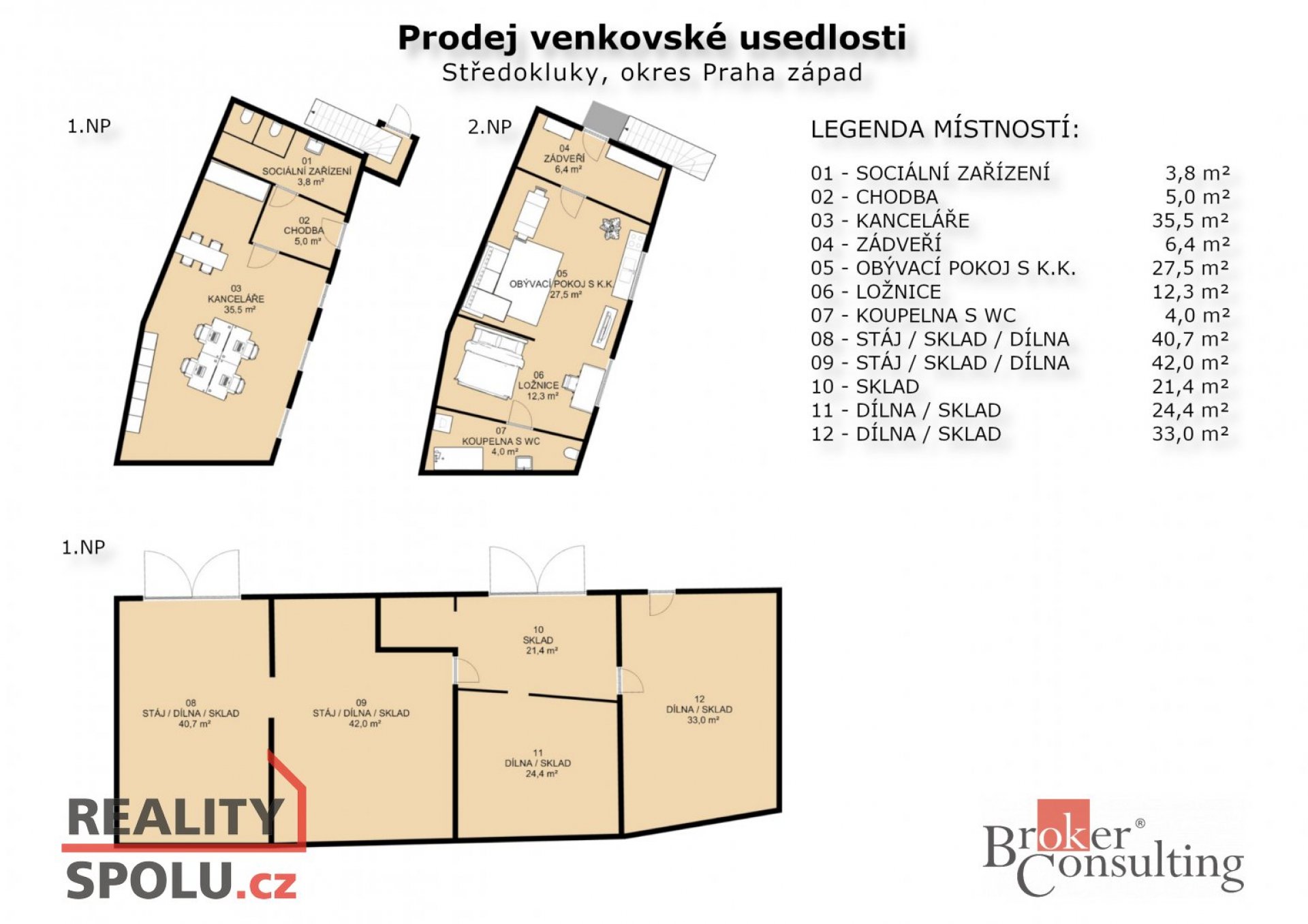 Prostor. Potenciál. Poloha. Tři slova, která vystihují tuto nabídku. Tento bývalý statek je ideální pro ty, kteří chtějí žít naplno, podnikat bez omezení a zároveň být na dosah Prahy. Hlavní budova – 10 velkých místností Propojte bydlení s prací nebo vytvořte jedinečný koncept: od rodinného zázemí až po kanceláře, výrobu, studio, firemní zázemí, přestavět dle potřeb... Druhá budova – 2 samostatné jednotky s možností využití na ubytování. Skvělé na pronájem, zaměstnance, rodinu nebo klienty. Dvoupatrová stodola Čeká na vás. Perfektní možnost pro sklady, dílny, ateliér nebo nové podnikatelské prostory. Proč Středokluky? Místo, které má budoucnost. D7: 2 minuty, Praha: 8 minut, Kladno: 12 minut Školka, škola, střední škola, sportoviště, koupaliště, rybářský revír Obec navíc chystá rozšíření chodníků a cyklotras – ideální pro rodiny i aktivní život Proč zrovna tato nemovitost? Protože vám dává svobodu. Protože nabízí velký prostor za cenu pražského bytu. Protože je to místo, kde můžete růst – osobně, rodinně i podnikatelsky. Tento statek je příležitost, kde máte možnost dát prostor své kreativitě a nápadům. Nečekejte, až si ji vezme někdo jiný! Půdorysy, vizualizace interiéru a exteriéru jsou pouze orientační a představují budoucí možnost využití a úprav. Celková užitná plocha 579 m2 je pouze orientační. Aktuální stav výměr se zpracovává odbornou kanceláří.
