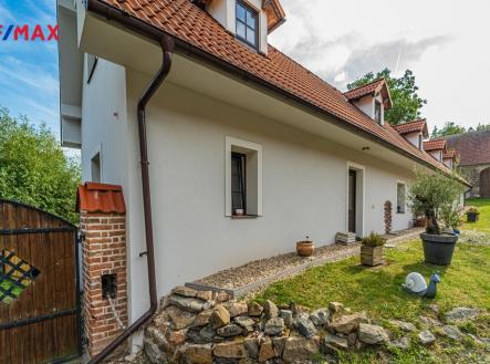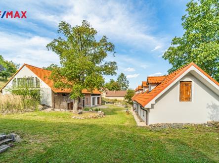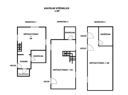 Nabízíme Vám ke koupi rodinný dům v rámci uzavřeného komplexu obytných a hospodářských budov s celkovou užitnou plochou 681 m2 a pozemkem o výměře 3572 m2 v obci Kostelní Střimelice (u Mnichovic). Komplex budov sestává z rodinného domu o třech jednotkách se samostatnými vchody přímo ze dvora, hospodářské budovy ve fázi rekonstrukce a přestavby na obytnou budovu a dále prostorné stodoly. Nemovitost je vhodná k vícegeneračnímu bydlení, podnikání či kombinaci obojího. Rodinný dům: Tři samostatné jednotky 3+kk, 2+kk, 1+kk, možnost další půdní vestavby. Výměry: 1.NP - 117 m², 2NP - 75 m². Budova prošla zásadní rekonstrukcí a má charakter novostavby. Bytová část je zděná z plných cihel a kamene, stropy cihelné klenbové a dřevěné trámové. Střecha sedlová s novou betonovou střešní krytinou, oprava fasády, výměna oken a rozvody všech inženýrských sítí (rozvody elektřiny, vody, odpadů, topení). Vytápění domu je zajištěno elektrickým kotlem do radiátorů a krbovými (kachlovými) kamny. Ohřev vody elektrickými bojlery. Hospodářská budova: Stavba prošla dílčí rekonstrukcí zahrnující výměnu střešní krytiny a zateplení střechy stříkanou pěnovou izolací, nové betonové podlahy, rozvody elektroinstalace, příprava koupelny, vyzdění nových příček. Stavba je ve fázi rekonstrukce a přestavby na obytnou budovu s obytnou plochou cca 217 m2 + garáž, altán a sklep. Plány znázorňují budoucí stav. Výhodou je prostorná garáž (44 m2) a přiléhající altán (38 m2), který lze užívat jako další prostor k parkování, dílna atp. či k venkovnímu krytému posezení. Okouzlí Vás i potenciál klenbového vinného sklepa z červených cihel (45 m2). Výměry: 1.NP - zázemí, koupelna, tech. místnost atp. 66,4 m² garáž 43,8 m² altán 38,5 m². sklep - 45 m² 2.NP - obytná část 3+1 (4+kk) 153 m². Uskupení budov uzavírá průjezdná stodola - zděná stavba po dílčí rekonstrukci a výměře 142 m². Krov a střešní krytina ve skvělém stavu. IS: el. 230/400V. Dva zdroje vody: rozvod vody z místního obecního zdroje, veřejný vodovod. Odpad - dvě odpadní jímky (pro RD a budovu v rekonstrukci). Na pozemku se dále nachází přírodní jezírko, ovocné a okrasné stromy a keře. Výhodou je velký pozemek 3572 m2, jenž nabízí další možnosti využití. Na pozemek jsou dva vjezdy. Obec Kostelní Střimelice nabízí dokonalé soukromí a klid venkovského života s velmi dobrou dostupností do Prahy – autem cca 30–40 minut po dálnici D1, exit Chocerady - Čerčany. Bus linka 490 do Ondřejova nebo Stránčic, odkud je možné využít železniční spojení do Prahy, nebo Benešova. Lokalita je ideální pro turistiku, cykloturistiku, houbaření či odpočinek v přírodě. Nedaleko se nachází také řeka Sázava a řada historických památek. Koupi nemovitosti lze financovat hypotečním úvěrem, který Vám v případě zájmu rádi vyřídíme na míru. Pro další informace a sjednání termínu prohlídky volejte.