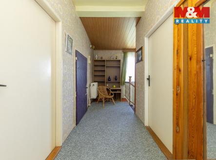 Prodej rodinné vily 4+1 s balkonem, na pozemku 1510 m² s užitnou plochou 166 m², k modernizaci dle svého stylu a pohodlí. Mimo jiné je zde výhoda okamžitého nastěhování a vaše vysněné úpravy domova realizovat postupně. Krytým vchodovým schodištěm se dostanete do předsíně, která dělí dům na jednotlivá podlaží: 1.NP - chodba 4 m², koupelna se sprchovým koutem 3 m², toaleta 1,5 m², kuchyně 19 m², spíž 1,5 m², neprůchozí obývací pokoj 19 m² s krbovými kamny, neprůchozí pokoj 19,5 m². 2.NP - chodba 11 m², neprůchozí pokoj 9 m², neprůchozí pokoj 19 m² a podkrovní pokoj 20 m², půdní prostory 8 m² dostupné z patra. Suterén - kotel na tuhá paliva, plynový kotel, který zajišťuje topení radiátory a ohřev vody. Zadní vchod do domu je ze zahrady a dvorku. Tady se nachází sezení pod pergolou, krásný ovocný sad, garáž a dílna. Na pozemku je prostor k relaxaci i vybudování bazénu. Parkování na pozemku pro až 6 aut. Pro více informací nás neváhejte kontaktovat.