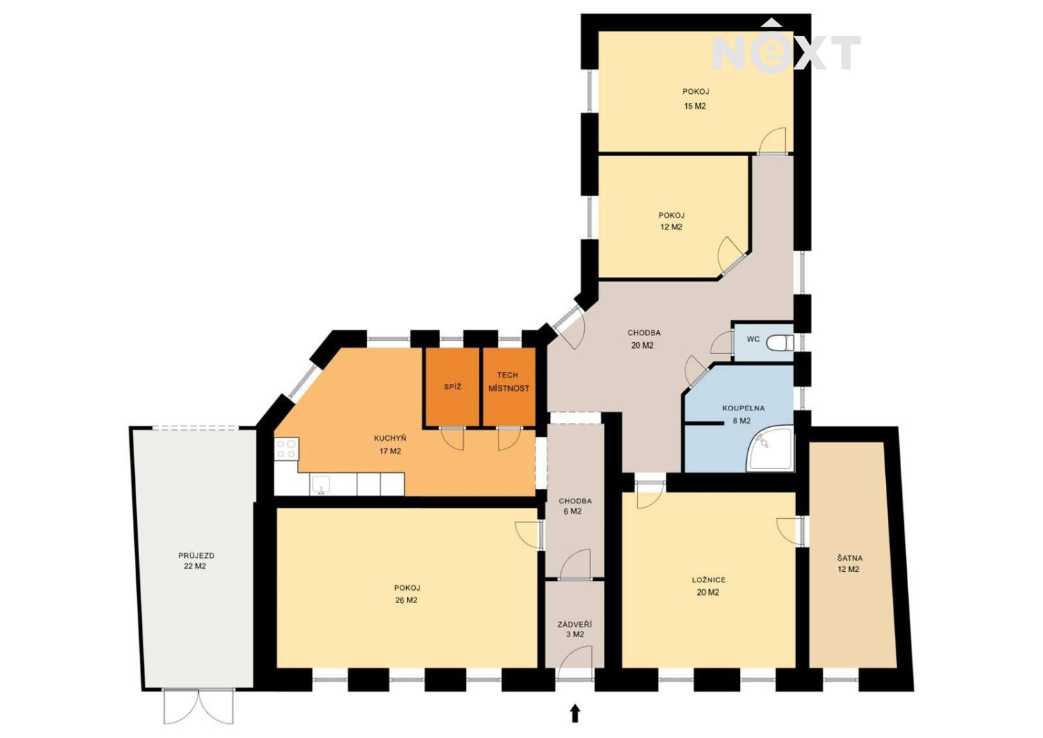 Nabízíme k prodeji krásné dvougenerační bydlení v Šumicích u Pohořelic. Jedná se o dvě samostatné stavby, hlavní dům, který prošel před 10-ti lety rekonstrukcí (jako původní zachována pouze uliční stěna), a vedlejší dům, přistavěný nově k hlavní stavbě. Dispozice hlavního domu ve tvaru L je zádveří, velká chodba, obývací pokoj, 3 ložnice, kuchyň, koupelna s vanou a samostatné WC. Výhodou hlavní stavby je, že se jedná o přízemní bezbariérový dům s na míru vyrobenými dřevěnými dveřmi, stejně jako ostatní vybavení domu. Z něho vede vstup na zahradu, která je u domu zařízena rekreační i užitková. V domě jsou rozvody klimatizace pro připojení jednotky, rozvody pro zabezpečovací systém, a v obývacím pokoji je rekuperátor vzduchu. Na přední dům navazuje dlážděné nádvoří a kryté posezení s možností vybudování letní kuchyně a odtud je vstup přímo do malé posilovny. Za posilovnou je novostavba druhého obytného, patrového domu. Jeho dispozice je obývací pokoj s kuchyňským koutem v přízemí, jehož součástí je schodiště do druhého patra se 3-mi ložnicemi, z nichž jedna je průchozí, a koupelna s toaletou. Novostavba je před kolaudací. Zastřešený průjezd vedle hlavního domu může sloužit jako garáž pro menší auto. Celková plocha zahrady je 935m2, a v zadní části umožňuje svou dispozicí a samostatným vjezdem po zpevněné komunikaci další stavbu. Pro komunikaci uvádějte evidenční číslo zakázky N116304.