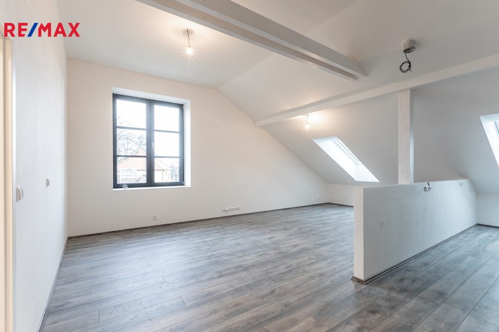 Exkluzivně nabízíme k prodeji výjimečný, luxusní, prostorný byt 3+kk ve druhém patře zděného, energeticky mimořádně úsporného domu postaveného v centru obce Svémyslice, jen pár minut jízdy autem od hranice města Prahy. Celková podlahová plocha bytu je dle prohlášení vlastníka 119,5 m2. Dominantou bytu je velký obývací pokoj spojený s kuchyní (o výměře 40,69 m2). Dále jsou v bytě ložnice se šatnou (o výměře 19,23 m2), dětský pokoj (o výměře 15 m2), vstupní chodba 6 m2, komora, samostatné WC a velká nádherně světlá koupelna s oknem na západní stranu. V koupelně je vana i sprchový kout a příprava na instalaci dvojumyvadla, pračky a sušičky. Byt je zcela nový a byl vystavěn v bytovém domě z roku cca 1916, kdy při rekonstrukci a výstavbě šesti bytů v tomto domě zbyly pouze původní obvodové a nosné zdi. Nové jsou stropy, podlahy, vnitřní příčky, střecha a samozřejmě veškeré rozvody v bytech i v domě. Budova je zděná se zateplením a díky rekuperačním jednotkám, které jsou umístěné v každém pokoji dosahuje PENB – A, mimořádně úsporná budova. Automatická výměna vzduchu/rekuperace Vám zajistí nejen velmi úsporné vytápění bytu, ale také neustálý přísun čerstvého vzduchu bez nutnosti otvírání oken. Vytápění bytu je komfortní – podlahové teplovodní. V domě je zaveden vysokorychlostní internet. Na všech střešních oknech jsou vnější žaluzie s elektrickým ovládáním. Orientace bytu je velice příznivá. Ložnice jsou směrem na severovýchod a světlý obývací pokoj má výhled na jih a do centra obce na západ. Vytápění a ohřev teplé vody je centrální, pomocí nové plynové kotelny v domě. K bytu náleží zděný sklep 6 m2 a dvě venkovní parkovací stání přímo u domu. Pár kroků od domu je MŠ, basketbalové a dětské hřiště, obecní úřad, kostel a autobusová zastávka ze které se pohodlně dostanete do Letňan nebo na Černý most. Dva kilometry od domu je nádraží Zeleneč, odkud se vlakem dostanete za 20 minut na Hlavní nádraží do Prahy nebo za 13 minut do Vysočan. Osobní vlastnictví – možnost financování hypotékou. V domě dále nabízíme tři bytové jednotky o velikosti 3+kk - 4+kk.