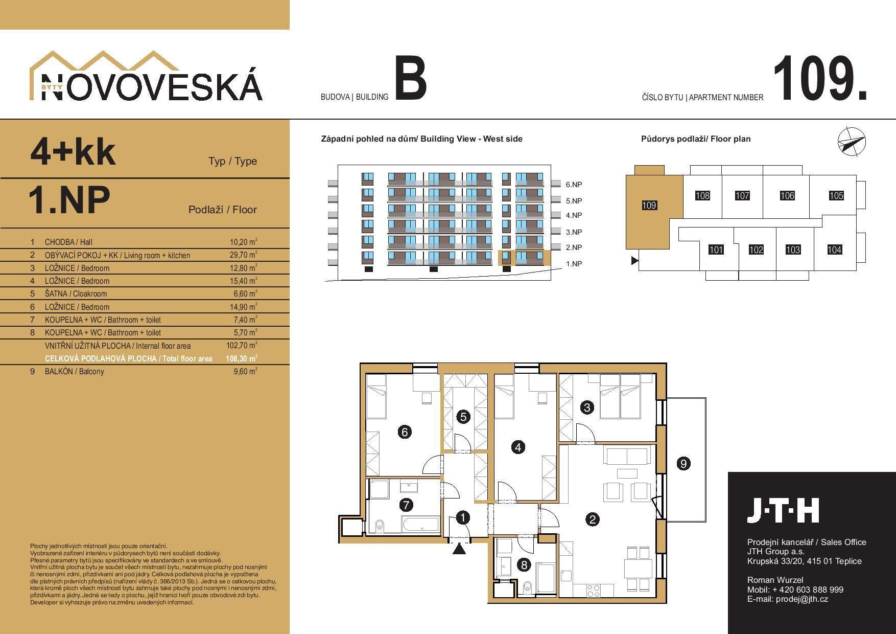 Velkorysý prostor nabízí byt č. 109 . Největší byt v celém komplexu se nachází v 1.NP a má dispozici 4+kk o velikosti 108 m2 + 9m2 balkon. Byt je díky bezbariérovému přístupu vhodný jak pro rodinu s dětmi tak pro hůře mobilní uživatele . Byt poskytne maximální pohodlí ve třech samostatných neprůchozích ložnicích. Šatnu o velikosti 7m2 a dvě samostatné koupelny přístupné ze vstupní chodby. Jedna z koupelen má k využití vanu i sprchový kout a druhá sprchový kout pro poskytnutí maximálního komfortu všech. Lokalita se nachází na ulici Novoveská nedaleko Řetenického lesoparku i proslulého věžového vodojemu se snadnou a výbornou dostupností do centra města. Je známá jako oáza klidu a vyhledávané místo oddechu.