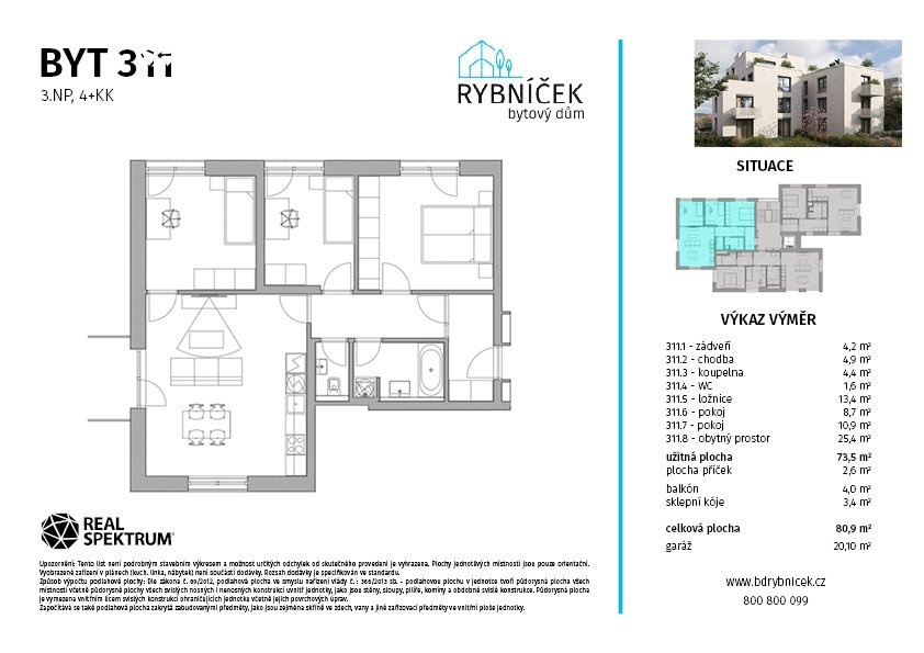 Ve výhradním zastoupení investora vám nabízíme moderní byt 4+kk s balkónem a vlastní garáží, který je součástí zcela nového čtyřpodlažního bytového domu v projektu Bytový dům Rybníček. Dispozičně velmi dobře řešený byt se vyznačuje dostatkem úložného prostoru. K bytu dále náleží prostorná sklepní kóje. Tento prostorný byt vyniká nadstandardním vybavením a moderním designem, který kombinuje vzdušný interiér s důrazem na praktičnost. Celý projekt je pečlivě zasazen do okolí a nabízí klidné prostředí v harmonii se zelení, přitom však zůstává ideálně propojen s městským životem. Perfektní lokalita: Tišnov – klid, příroda a skvělá dopravní dostupnost Bytový dům Rybníček se nachází ve vyhledávaném městě Tišnov, přímo pod malebným vrchem Klucaniny. Tato lokalita je ideální pro milovníky přírody, kteří si přitom chtějí zachovat pohodlný přístup k městské infrastruktuře. Vlakové a autobusové spojení do Brna je rychlé a pohodlné, díky čemuž je Tišnov atraktivní volbou pro každodenní dojíždění za prací, studiem nebo zábavou. Samotný Tišnov nabízí kompletní občanskou vybavenost – mateřské a základní školy, vyhlášené gymnázium, střední škola, obchody, lékařskou péči, restaurace a kulturní i sportovní vyžití. Na své si přijdou také milovníci turistiky a cyklistiky, kteří ocení širokou síť stezek v okolí. Bydlení, které spojuje příjemné s praktickým Projekt Bytový dům Rybníček je ideálním řešením pro ty, kteří hledají moderní bydlení na klidném místě s vynikající dostupností do města. Kombinace kvalitního provedení, promyšleného designu a atraktivní lokality dělá z tohoto bytu jedinečnou příležitost pro vlastní bydlení nebo jako investici. Pro více informací nás neváhejte kontaktovat a domluvte si osobní schůzku. Těšíme se na vás! Dispozice: zádveří (4,2 m²), chodba (4,9 m²), pokoj s kuchyňským koutem (25,4 m²), pokoj (13,4 m²), pokoj (10,9 m²), pokoj (8,7 m²), koupelna (4,4 m²), WC (1,6 m²), balkon (4,0 m²), sklepní kóje (3,4 m²), garáž (20,1 m²)
