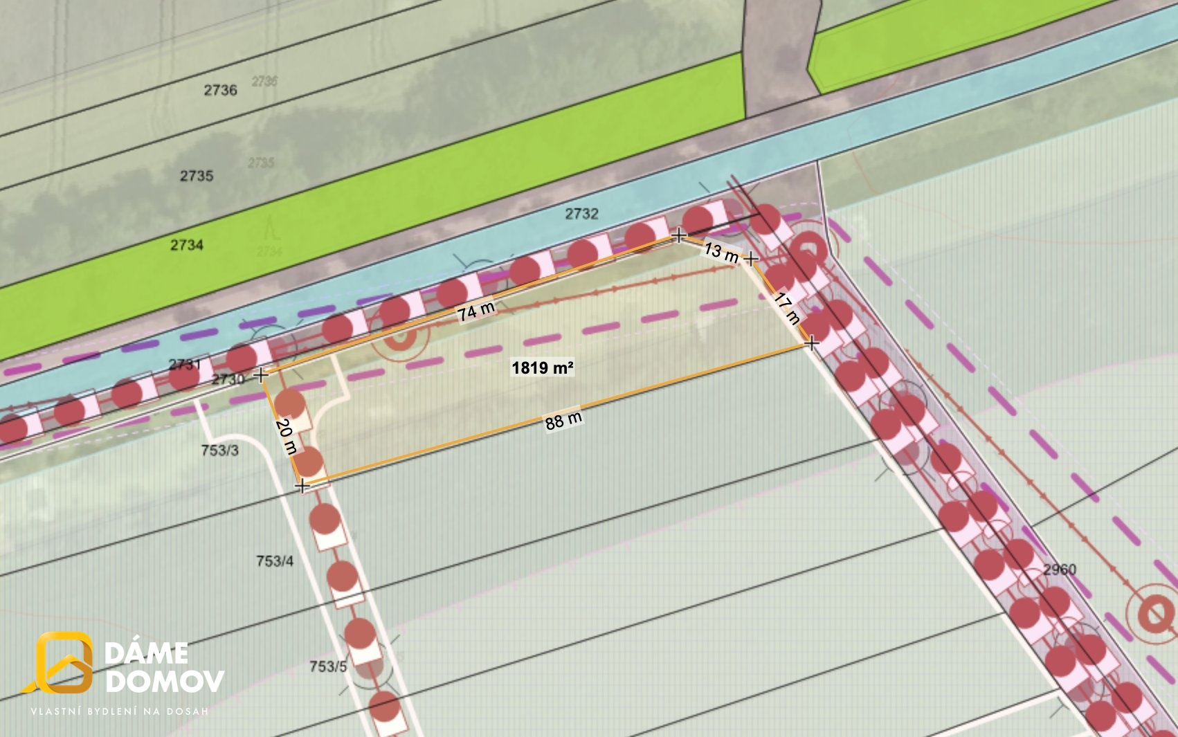 Stavební pozemek 1 819 m² | Bydlení individuální | Tlumačov na Moravě Nabízíme k prodeji stavební pozemek parc. č. 753/3 o výměře 1 818 m², nacházející se v obci Tlumačov na Moravě. Dle platného územního plánu je pozemek určen k využití BI – Bydlení individuální, tedy vhodný pro výstavbu rodinného domu. Základní informace výměra: 1 819 m² parcelní číslo: 753/3 územní plán: Bydlení individuální rovinatý vhodné pro samostatně stojící rodinný dům Možnosti využití výstavba rodinného domu investiční záměr dostatek prostoru pro zahradu, bazén či další zázemí Šířka pozemku: 20 m Délka pozemku: 88 m Sítě: elektřina a kanalizace u pozemku, voda ve vzdálenosti 150 m Pozemek nabízí ideální velikost pro komfortní bydlení s dostatkem soukromí. Lokalita Tlumačov je vyhledávanou obcí s dobrou dostupností do okolních měst a kompletní občanskou vybaveností. Kombinuje klid venkova s výborným napojením na hlavní dopravní tahy.