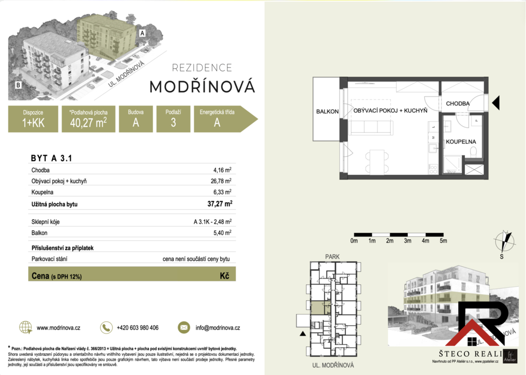 Nabízíme k prodeji byt v developerském projektu Rezidence Modřinová, nacházející se na ulici Modřínová v Třebíči. Tento projekt je novostavbou, která se dokončí v BŘEZNU- DUBNU 2026, což představuje jedinečnou investiční příležitost.Jedná se o moderní byt o dispozici 1 + kk, s plochou 40,27 m², umístěný v 2. nadzemním podlaží cihlového objektu. Byt bude vybaven elektrickými předokenními roletami, což zajistí komfortní bydlení po celý rok. Projekt splňuje přísné normy moderní výstavby a pyšní se energetickým štítkem třídy A. Z okna se naskýtá nádherný výhled na celou Třebíč, který potěší každého obyvatele. Velmi dobře nastavený platební kalendář ponechává budoucím majitelům flexibilitu v oblasti financování. Výhodou této nemovitosti je, že projekt staví místní stavební firma TOMIreko a.s., která má více než 15 let zkušeností ve stavebnictví. Díky tomu se můžete spolehnout na vysokou kvalitu provedení a spolehlivost. Díky blízkosti k Jaderné elektrárně Dukovany je tento projekt velmi zajímavou volbou pro investory, kteří hledají zajištěnou návratnost. Kromě výhodné lokalizace se obyvatelé mohou těšit na kvalitní infrastrukturu a všechny potřebné služby v dosahu. V případě zájmu o prohlídku nás neváhejte kontaktovat.