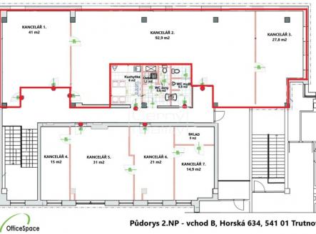 Pronájem luxusních kanceláří o celkové ploše 160 m2, v objektu Hoská 634, Trutnov. Jedná se o luxusní kancelářské prostory v centru Trutnova.Možnost pronájmu kanceláří od 20 do 160 m2. Na patře je společná kuchyňka a dámské a pánské toalety. Kanceláře lze pronajmout vcelku nebo samostatně. Další kancelářské prostory jsou volné přímo na KB a.s., ve 2. a 3.np, o plochách cca 20 až 40 m2, možno i na studio, je zde přivedena voda a odpad.Prostory jsou volné, připavené k okamžitému nastěhování.ID.63425.
