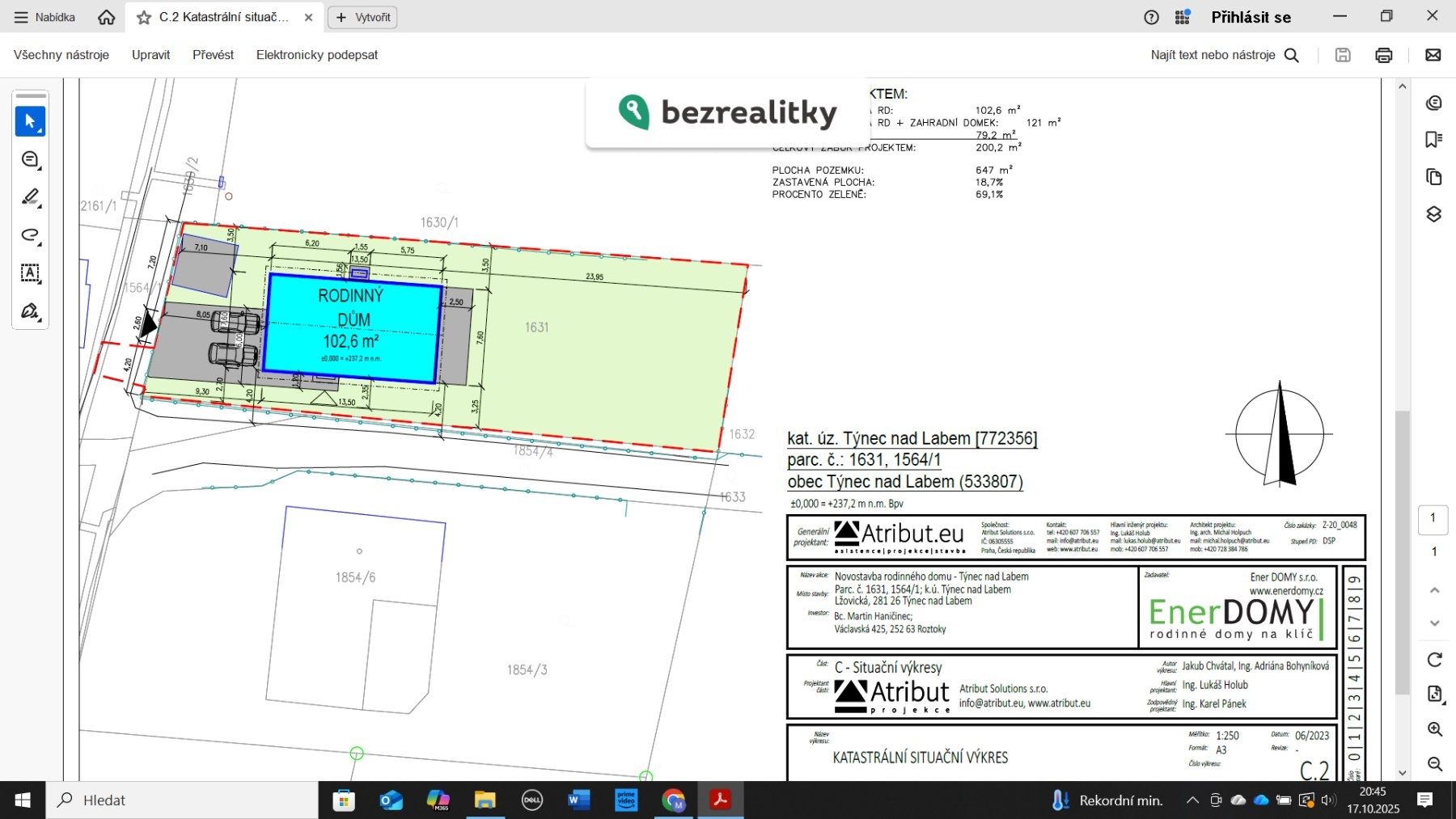 Prodám zasíťovaný osluněný stavební pozemek včetně vydaného stavebního povolení o výměře 644 m² v Týnci nad Labem poblíž centra města. Možnost začít okamžitě stavět! V ceně pozemku je i projekt zděného bungalovu Economy A od společnosti Enerdomy ve variantě 4+kk (možnost úpravy na 3+kk), který pro vás tato stavební firma postaví na klíč za 4 120 000 Kč. Elektřina je na pozemku, součástí projektu jsou i přípojky vody a kanalizace, které vedou v přilehlé komunikaci. Pozemek má rozměry 43 x 15 m, je oplocený, téměř rovinatý. Aktuálně zde stojí dřevěná chata cca 4x4 metry. Samozřejmě je možné postavit i jiný dům, koeficient zastavitelnosti je až 40%, 2 nadzemní podlaží + podkroví. Klidné místo v bývalé zahrádkářské kolonii, přesto v pěším dosahu centra, poblíž Týneckých rybníků. Občanská vybavenost přímo ve městě, dále Kolín 10 min., dálnice D11 na Prahu 15 min., Praha - Černý Most 40 minut. Tato nemovitost je určena výhradně přímým zájemcům o koupi. Na inzerát můžete také reagovat přímo na webu Bezrealitky.