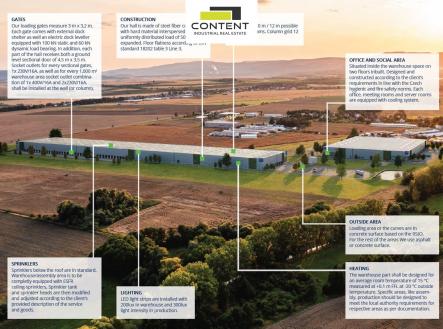 Pronájem skladu, výrobních prostor 10000 m² Chomutov. V zastoupení majitele a bez provize nabízíme atraktivní novostavbu skladu nebo výrobních prostor v nově vznikajícím logistickém parku u dálnice D7, exit 75. - budova k dodání do 12 měsíců, - samostatná industriální budova 25754 m², lze dělit od cca 2500 m², - světlá výška 10 m, - bezprašné podlahy s nosností minimálně 5 t/m², - vstupy z hydraulických ramp i v úrovni vozovky, - sprinklery, EZS, EPS, - příjezd a manipulace TIR bezproblémová, parkování zdarma, - kancelářské prostory, vzorkovna na míru budoucího nájemce, - možnost výstavby celé budovy na míru, přesně dle požadavku zájemce (BTS) Cena bude stanovena dle dalších požadavků individuálně. Fotografie hotových budov jsou ilustrační, z již proběhlé výstavby. Pro více informací nás kontaktujte.