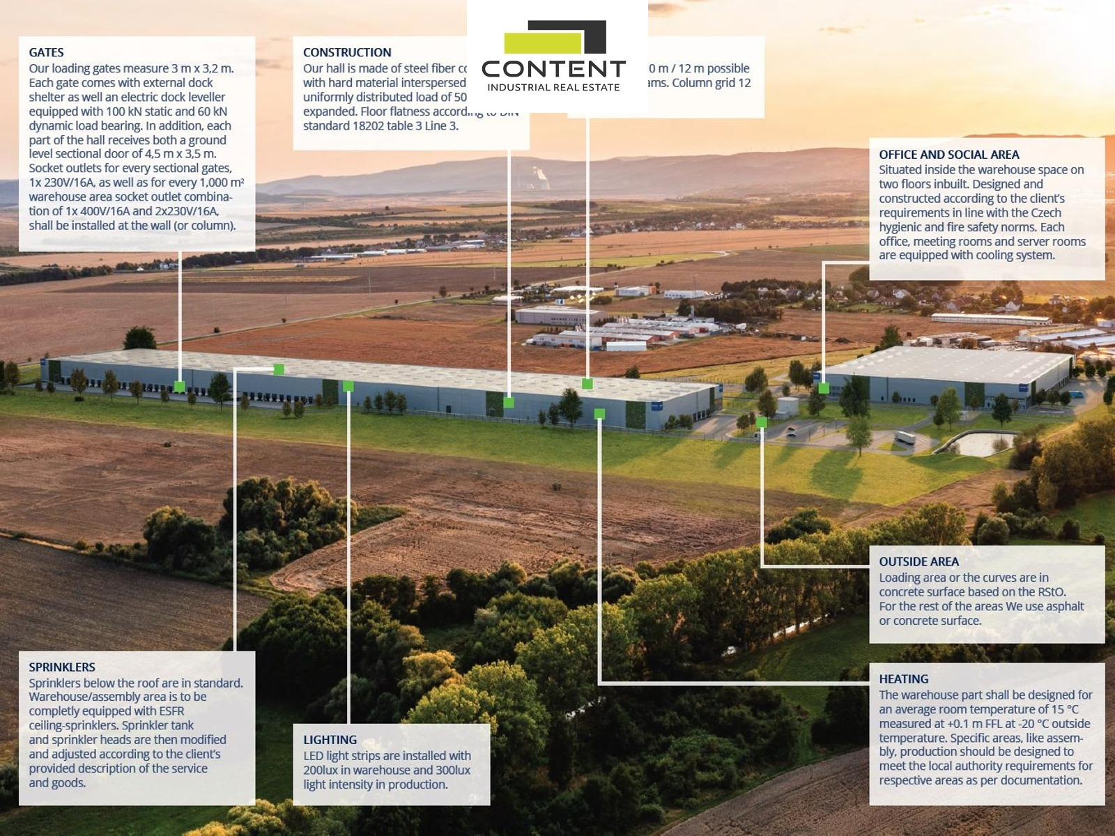 Pronájem skladu, výrobních prostor 5000 m² Chomutov. V zastoupení majitele a bez provize nabízíme atraktivní novostavbu skladu nebo výrobních prostor v nově vznikajícím logistickém parku u dálnice D7, exit 75. - budova 25754 m² k dodání do 12 měsíců, - lze rozdělit na samostatné prostory od cca 2500 m², - světlá výška 1O m, - bezprašné podlahy s nosností minimálně 5 t/m², - vstupy z hydraulických ramp i v úrovni vozovky, - sprinklery, EZS, EPS, - příjezd a manipulace TIR bezproblémová, parkování zdarma, - kancelářské prostory, vzorkovna na míru budoucího nájemce, - možnost výstavby celé budovy na míru, přesně dle požadavku zájemce (BTS) Cena bude stanovena dle dalších požadavků individuálně. Fotografie hotových budov jsou ilustrační, z již proběhlé výstavby. Pro více informací nás kontaktujte.