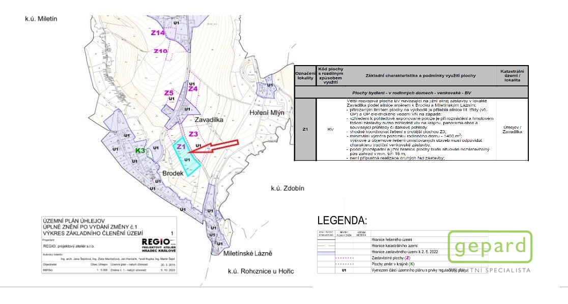 Společnost Gepard Reality Vám nabízí stavební pozemek o rozloze 2072 m2 v obci Úhlejov v okrese Jičín. Jedinečné umístění tohoto pozemku může pomoci splnit Vaše sny o bydlení či rekreaci v nádherné přírodě a zároveň v dosahu základních služeb. Úhlejov leží na jižním úpatí hory Zvičiny. Prochází zde cyklistické a turistické trasy a páteřní koňská stezka, která spojuje Vídeň s Baltem. Ve fotogalerii představujeme vizualizaci RD, který odpovídá požadavkům pro výstavbu na tomto pozemku. Jedná se o unikátní koncept výstavby rodinných domů založený na vztahu k přírodě a trvalé udržitelnosti. Pokud byste chtěli do roka bydlet právě zde a právě v takovém domě, můžeme to ve spolupráci s naším partnerem zařídit. Nabízený pozemek spadá dle územního plánu do zastavitelného území. Odpadní vody je nutné řešit individuálně, zdroj vody vlastní studnou a připojení elektřiny vybudováním nové přípojky. Výstavba rodinných domů či staveb rodinné rekreace by měla odpovídat charakteru tradiční venkovské zástavby v této lokalitě: umístění stavby ve vazbě na veřejnou komunikaci, výrazně obdélníkový půdorys či ve tvaru L a T, min. šířka užší (štítové stěny) 6 m, zastřešení rovnoramennou sedlovou střechou o sklonu 35 - 45°, nadezdívka max. 50 cm, barevnost fasády v tlumených odstínech, max. 1 nadzemní podlaží + podkroví, max. 2 bytové jednotky. V blízkosti pozemku je obecní úřad, který je i kulturním domem, a autobusová zastávka spoje do Miletína a Lázní Bělohrad. V Miletíně je k dispozici základní občanská vybavenost (MŠ, ZŠ, pošta, obchody, restaurace a další služby). Ke koupání je možné využít koupaliště, které téměř sousedí s nabízeným pozemkem, nebo nedaleký Třebihošťský rybník (2 km). Největší předností této lokality je kvalitní, čisté a nepoškozené životní prostředí a krásná krajina a příroda. Miletínské lázně zv. Svatojanské (vzdálené jen 10 minut pěšky) byly vyhlášené účinky léčivé vody z místních pramenů, pro kterou sem i dnes jezdí lidé z širokého okolí. V nedalekých Lázních pod Zvičinou bývaly klimatické lázně a zdejší voda z Mariánské studánky je podle legendy považována za zázračnou. Traduje se, že místní svěží vzduch a léčivá voda Vám prodlouží život o několik let. Blízké Lázně Bělohrad jsou využívány dodnes. Zajímavým výletním cílem je Raisova chata s otáčivou rozhlednou na vrchu Zvičina. Za mimořádných rozhledových podmínek lze prý odtud zhlédnout třetinu Čech. Jedná se o vynikající místo pro paragliding. Dříve se zde v zimě lyžovalo, nyní je jistější dojet (cca 40 minut) na sjezdovky v Krkonoších (Herlíkovice a Mladé buky). Dále můžeme doporučit následující tipy: Safari Park ve Dvoře Králové, Přehrada Les Království, Hrad Pecka, hospitál Kuks a skalní Braunův Betlém, Hořice a další. V případě zájmu zajistíme výhodné podmínky financování a případný prodej Vaší stávající nemovitosti. Pro více informací mne, prosím, kontaktujte.