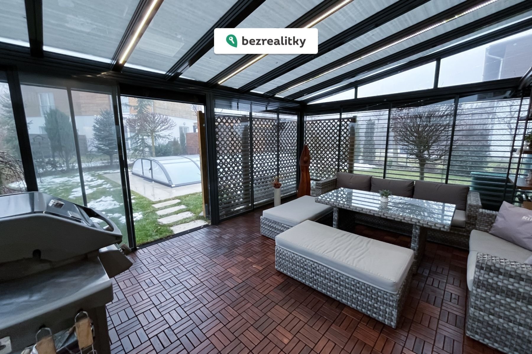 Rodinný dům 114 m² s bazénem, saunou a zimní zahradou na pozemku 400 m² – Úhonice, Nabízíme k prodeji prostornou moderní část dvoudomku z roku 2015, která spojuje pohodlí, moderní design a klidné soukromí. Tento nízkoenergetický dům je ideální pro rodinu hledající harmonii mezi komfortem moderního bydlení a blízkostí přírody. Nachází se v tiché části obce Úhonice, obklopené lesy a zelení, kde každý den můžete začínat procházkou, sportem či relaxací. Přízemí tvoří prostorný obývací pokoj s kuchyňským koutem, odkud je přímý vstup do prostorné zimní zahrady o rozloze 22 m². Díky klimatizaci, která zároveň slouží jako topení, je tento prostor využitelný po celý rok. Přízemí doplňuje vstupní chodba, technická místnost a koupelna se sprchovým koutem a toaletou. V patře se nachází ložnice s vestavěnou šatnou a klimatizací, hlavní koupelna s vanou a prostorný pokoj pro hosty, který lze snadno upravit na dvě dětské místnosti. Zahrada nabízí ideální prostor pro odpočinek i zábavu. Zapuštěný bazén s protiproudem, tepelným čerpadlem, osvětlením a zastřešením poskytuje komfortní relaxaci, hned vedle stojí samostatná sauna a součástí pozemku je také velký zahradní domek pro skladování nebo hobby. Zastřešené parkovací stání s pojízdnou bránou a nový nátěr fasády z roku 2025 zajišťují pohodlí a bezstarostný provoz. Úhonice nabízejí harmonické rodinné bydlení s veškerou občanskou vybaveností – školy, dětská hřiště, poštu, restaurace a obchody – a přitom poskytují klid a soukromí. Lesy a příroda v okolí jsou ideální pro procházky a sportovní aktivity, a do Prahy či k velkým obchodním centrům, jako jsou Metropole Zličín, IKEA nebo Globus, se dostanete autem během několika minut. Tento dům není jen místem k bydlení – je to prostor, kde si rodina může užívat pohodlí moderního bydlení, relaxovat u bazénu a sauny, trávit čas venku i uvnitř a těšit se z klidné a přátelské atmosféry obce. Dalším praktickým benefitem je probíhající výstavba kanalizace s plánovaným uvedením do provozu v roce 2026. Výhodou jsou také velmi dobré sousedské vztahy a klidná atmosféra lokality. Tato nemovitost je určena výhradně přímým zájemcům o koupi. Na inzerát můžete také reagovat přímo na webu Bezrealitky.