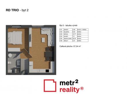 Ve výhradním zastoupení majitele Vám nabízíme k prodeji novostavbu bytu o dispozici 2+kk v domě o třech bytových jednotkách. Dům je nyní ve výstavbě a termín dokončení je přelom jara, léta příštího roku. Byt má výměru 53,03 m2, k bytu náleží sklep o výměře 4,31 m2, zahrádka o výměře 40,29 m2 a dále je v ceně bytu zahrnuto parkovací stání vedle domu. Bytové jednotky budou rozděleny prohlášením vlastníka a zahrádky budou ve výlučném vlastnictví budoucího vlastníka. Dům je postaven z cihel, má sedlovou střechu, krytina plechová šablona v imitaci pálené tašky. Okna plastová, zasklená izolačním trojsklem. Na podlahách v bytové jednotce bude keramická dlažba, v pokojích pak belgická laminátová podlaha Vitality Style Aqua Protect z koncernu Unilin (Quick-step). Vytápění bude zajištěno tepelným čerpadlem a teplovodní otopnou soustavou podlahového vytápění s rozdělovačem. V bytě pak bude rekuperace. Byt je velmi dobře dispozičně řešen, z obývacího pokoje s kuchyňským koutem je vstup na terasu francouzským oknem, terasa je osvětlená a je zde venkovní nezámrzný ventil na zalévání zahrádky. Ložnice se samostatným vstupem z předsíně a koupelna se sprchovým koutem a toaletou. Součástí ceny je vydlážděná terasa i oplocení zahrádky. Dům je postaven s důrazem na použití kvalitních a moderních materiálů a je předpoklad velmi nízkých nákladů na bydlení. Dům se nachází v nově vznikající lokalitě v blízkosti parku. V bezprostřední blízkosti se nachází obchodní centra a veškerá občanská vybavenost. Cena zahrnuje kompletně dokončenou bytovou jednotku vyjma kuchyňské linky, zahradu, sklep a dvě parkovací stání. Byt je vhodný jak k bydlení tak na investici a následné pronajímání. V případě zájmu o prohlídku mne neváhejte kontaktovat.