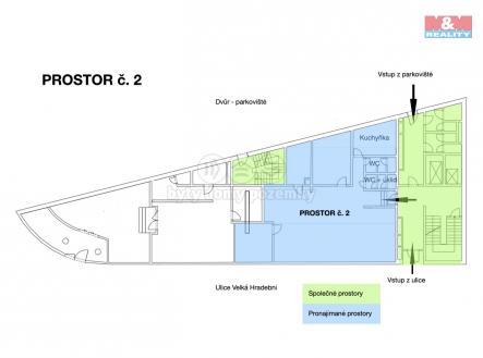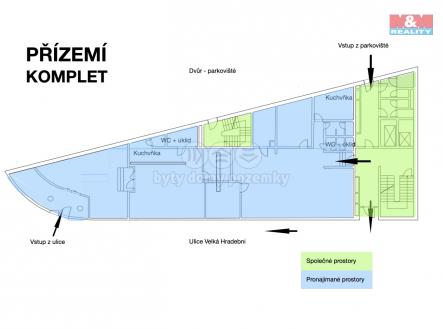 Hledáte-li obchodní prostory vhodné pro kancelářské účely, služby i obchod, tak Vám nabízíme tři varianty pronájmu na lukrativním místě v Ústí n/L. První možností je pronájem prostor s výměrou cca 130 m² a druhou je prostor s výměrou cca 150 m² za jednotlivou cenu 40000,- Kč za jeden měsíc. Nebo můžete využít jako třetí možnost pronájem prostor jako celku za cenu 80000,- Kč za jeden měsíc. Uvedené nájmy jsou bez DPH (u neplátců se DPH nehradí) a je k nim účtována spotřeba energií na základě skutečné spotřeby dle měsíčních odečtů instalovaných měřidel (elektrická energie, vodné a stočné a topení) a odvoz komunálního odpadu + DPH. Všechny prostory disponují vlastním WC/úklidovou komorou, kuchyňkou a jsou klimatizovány. Přístup do objektu je z ulice u křižovatky Velká Hradební/Pařížská/Dlouhá s celoplošnými výlohami směrem do ulice. Výhodou jsou parkovací místa v zadním traktu budovy za cenu 12 000,- Kč/rok + DPH. Pronajímatel nepožaduje žádnou kauci, hradíte provizi za zprostředkování.